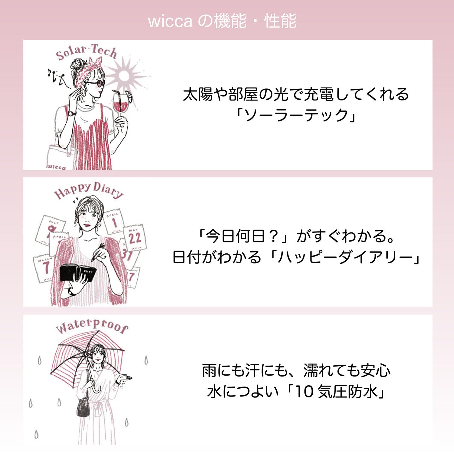 【時計が必要な場面に嬉しいwicca】学生、就活など試験でデジタルツールが持ち込めない場面でも、wiccaなら寄り添えます。「1分毎のめもり」、「秒針」など腕時計に欲しい仕様を盛込みました。太陽や部屋の光で充電してくれる「ソーラーテック」だから、めんどうな電池交換はいりません。「10気圧防水」だから、雨にも汗にも濡れても安心です。