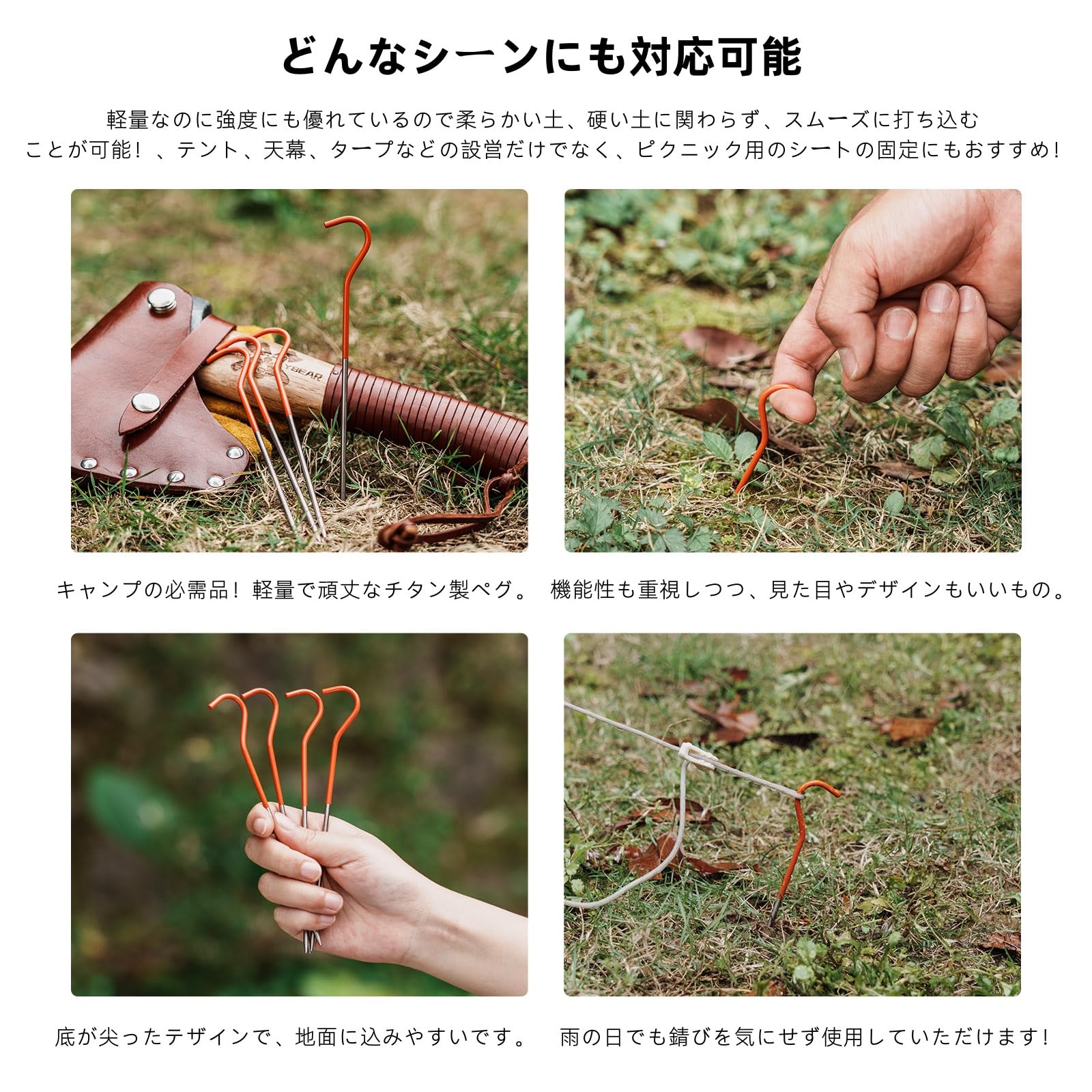 高強度のチタン合金ペグは耐腐食性、耐久性に優れています。テントとキャノピーの取り付けに使用と固定に適しています。風を受けやすい大型タープや大型テントでもがっちり固定できる最高強度を誇るペグです。
