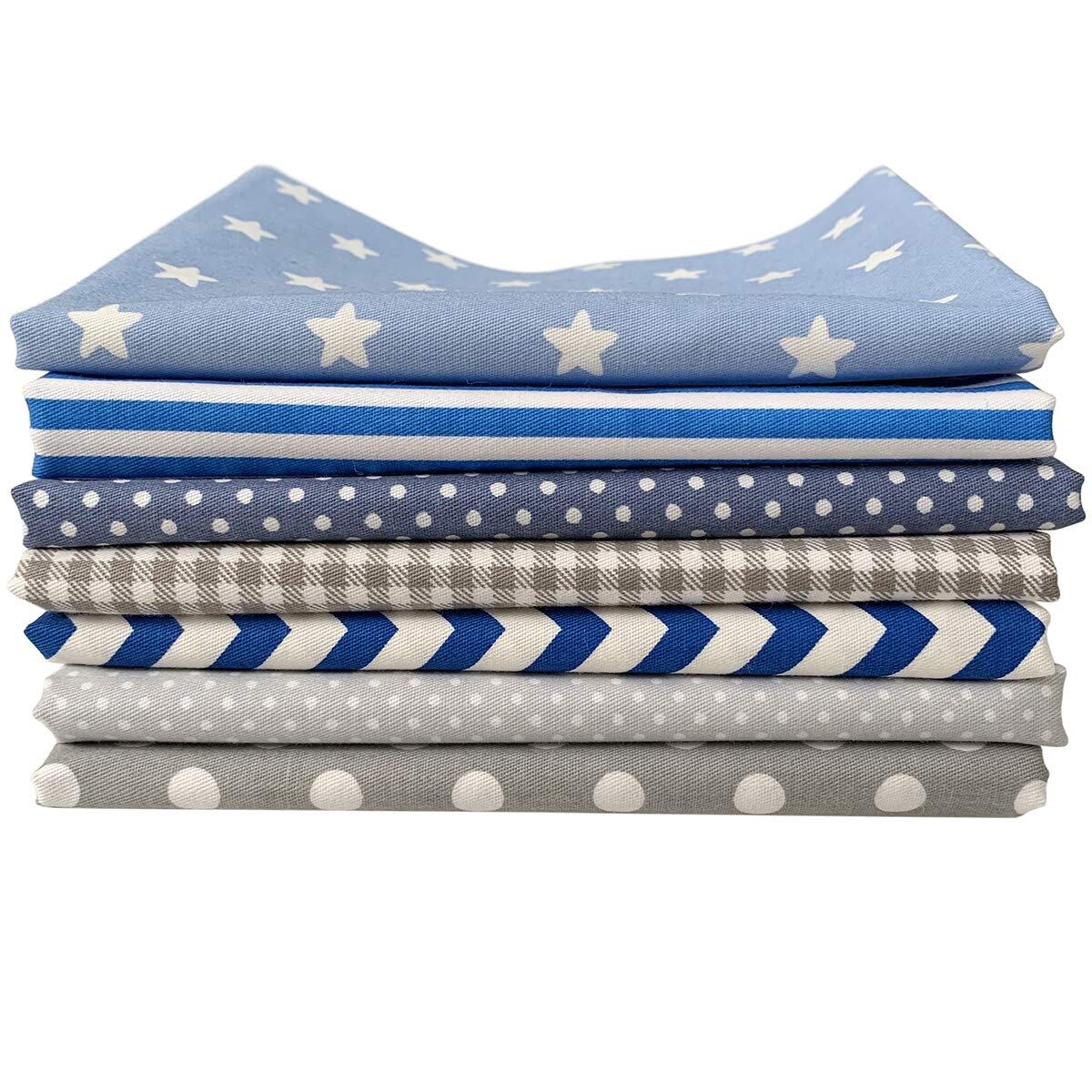7枚 グレー&ブルー生地 布 大柄 綿100% 手芸 手作り 布地 セット 46×56cm ドット・星・チェック・波線