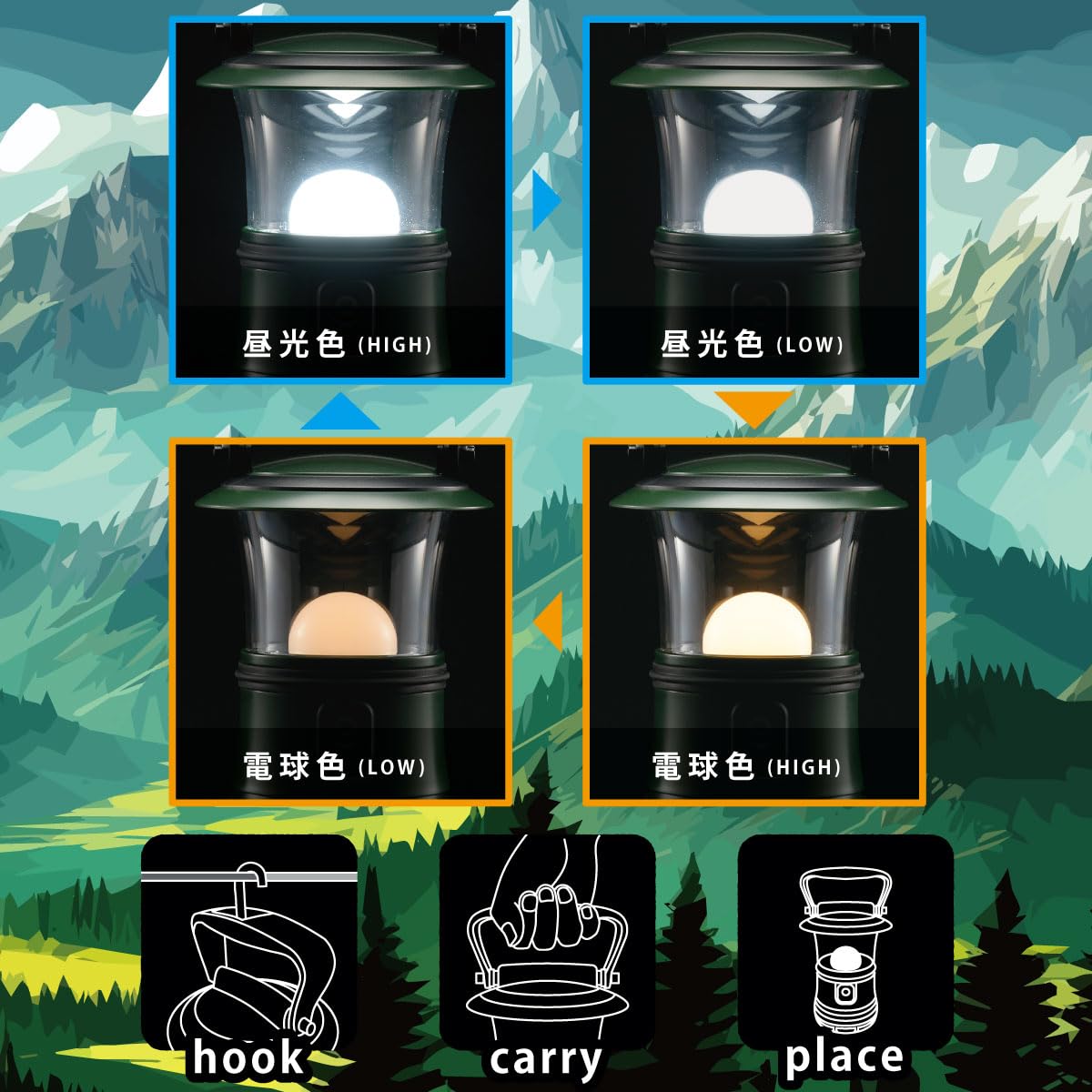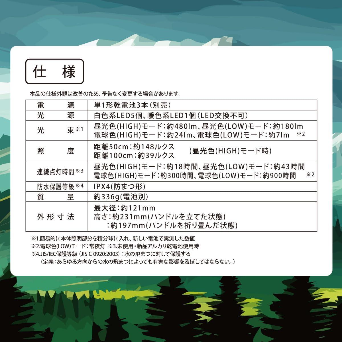 【 仕 様 】 ◆電源:単1形乾電池×3本(別売) ◆光源:白色系LED5個、暖色系LED1個(LED交換不可) ◆光束:・ 昼光色(HIGH)モード…約480 lm、昼光色(LOW)モード…約180 lm・ 電球色(HIGH)モード…約24 lm、電球色(LOW)モード…約7 lm