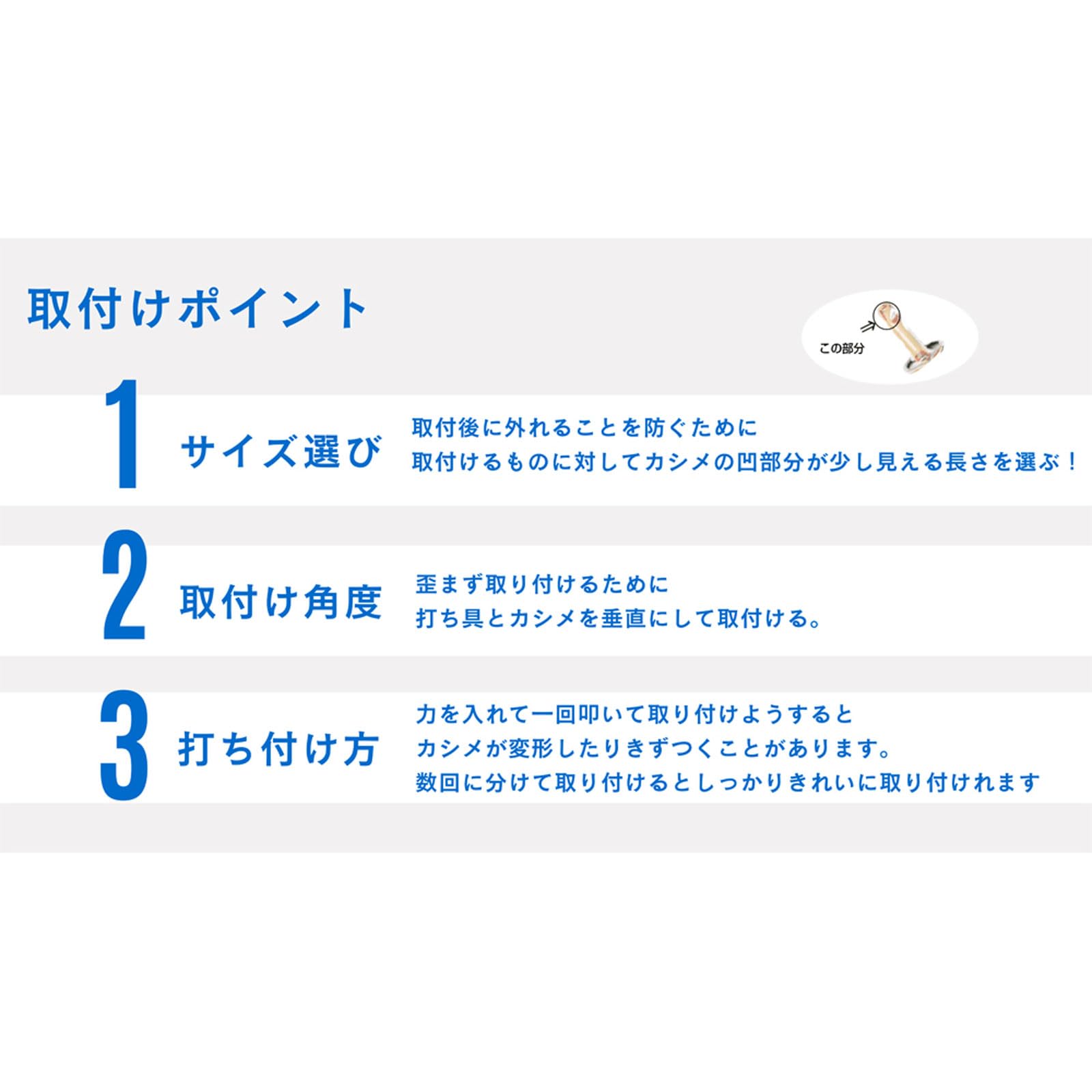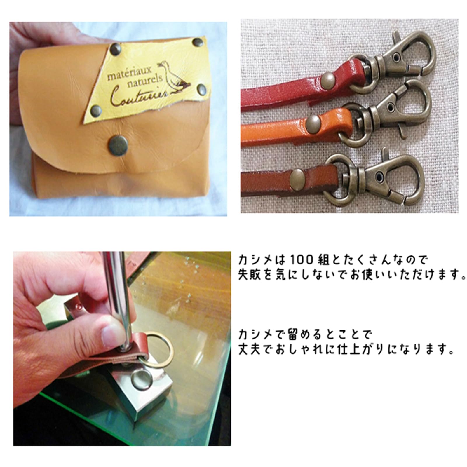 カシメの付け方は専用の工具(打ち具)で付けます。 付け方のコツは打ち具とカシメを垂直にして取付けます。 釘を打つように数回に分けて付けて最後に力を入れて取付ければ外れることはありません。