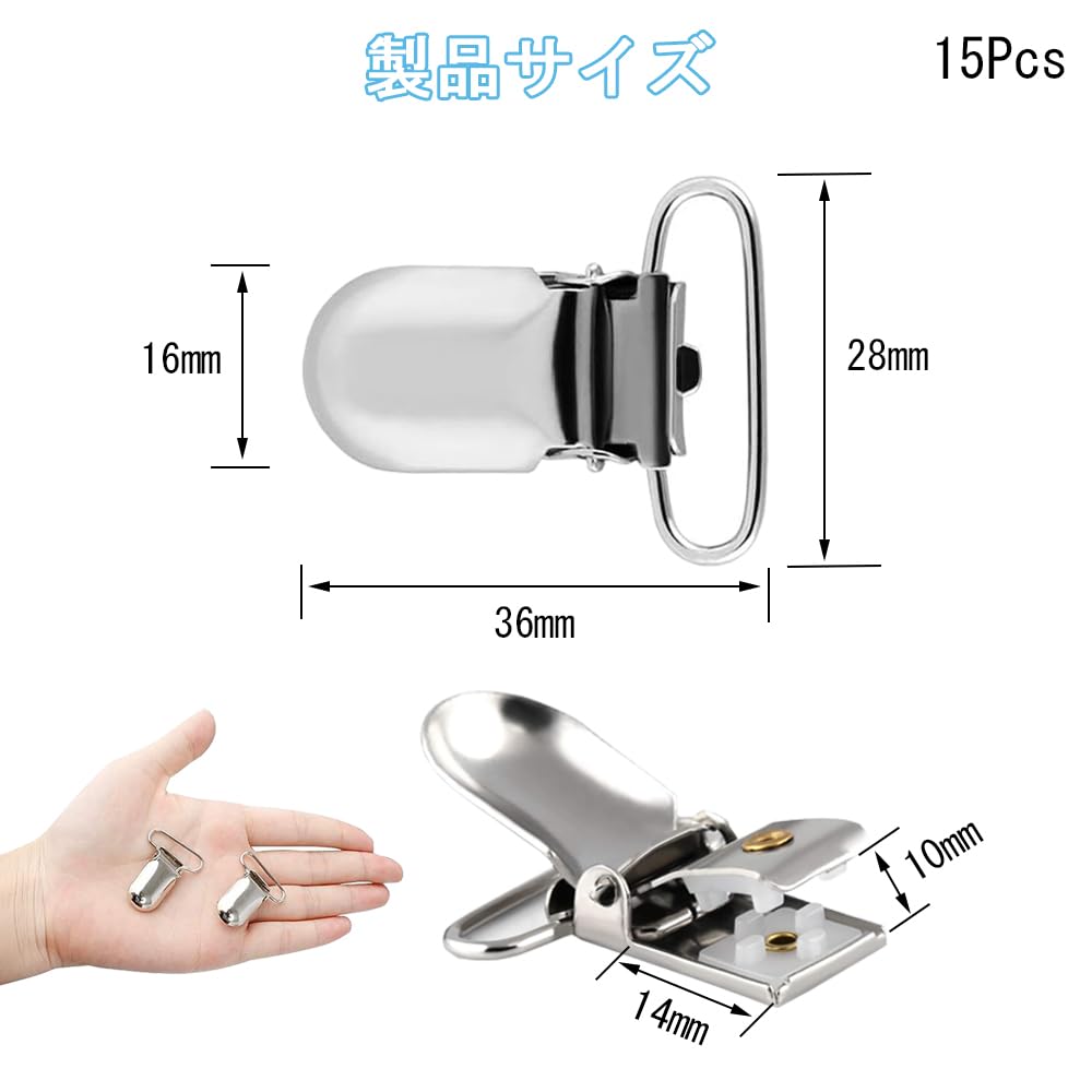 サスペンダー クリップ ワンタッチクリップ 15個入 紐調整に 長さ調整 落下紛失防止 新生児、赤ちゃんに適している 多機能 DIY 汎用 かわいい クリップ(銀色)