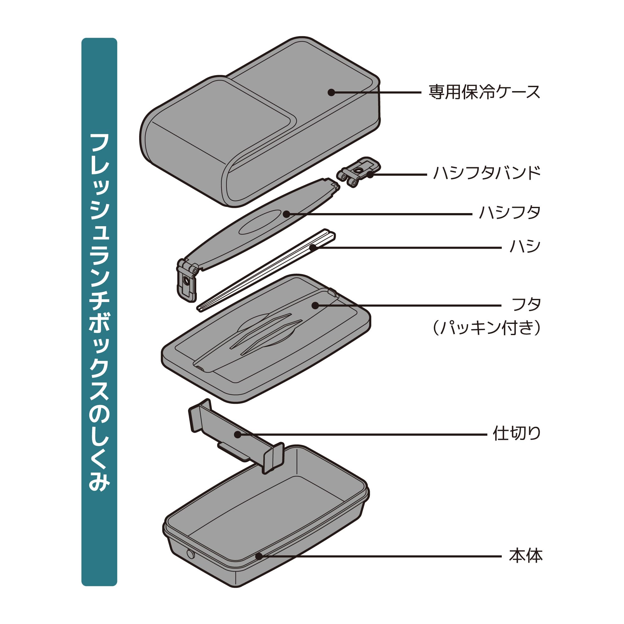 素材・材質:本体・仕切り・フタ:ポリプロピレン / ハシフタ:ABS樹脂 / ハシフタバンド・パッキン:シリコーンゴム / ハシ:メタクリル樹脂 /【専用保冷ケース】外生地・内生地:ポリエステル / クッション(断熱材):発泡ポリエチレン