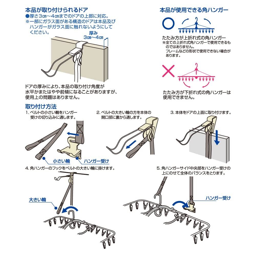 ●工具なしで簡単! ドアに引っ掛けて、部屋干しスペースが作れるドア用フックです。●ベルトを使用すると角ハンガーをちょうど良い高さで水平に干すことができます。●風通しが良いお部屋の入り口で干して、気になるお部屋の湿気予防に。●フック部分は洗濯物がない時、コートやカバンのちょい掛けにも使用できます。※耐荷重は1本につき3kgまでです。