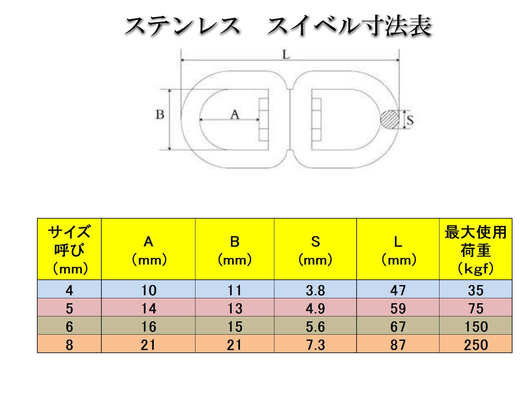 【許容使用荷重】呼び4mm 80kgf 呼び5mm 120kgf 呼び6mm 180kgf 呼び8mm 250kgf ロープ、ケーブル、ベルト、鎖,チェーン、金具などを接続して中心部が回転してねじれを防止します。 アイデアを生かして色々な用途に使用できます