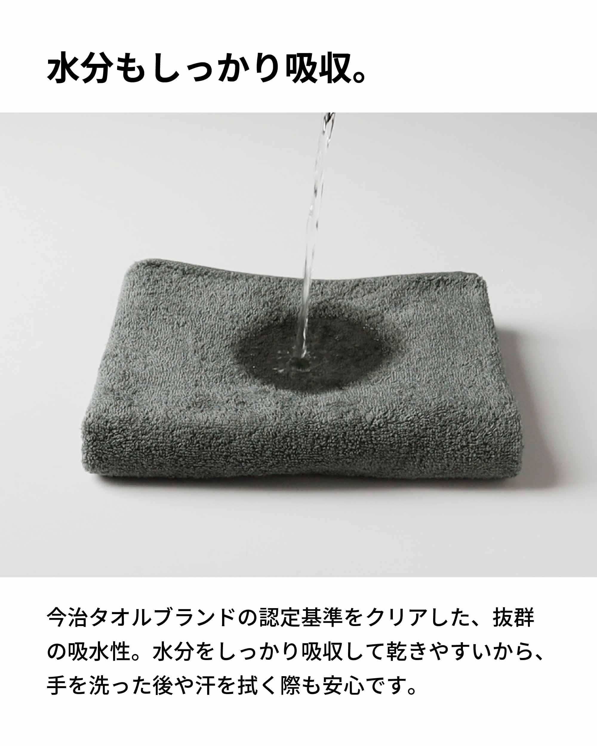 水分もしっかり吸収。今治タオルブランドの認定基準をクリアした、抜群の吸水性。水分をしっかり吸収して乾きやすいから、手を洗った後や汗を拭く際も安心です。
