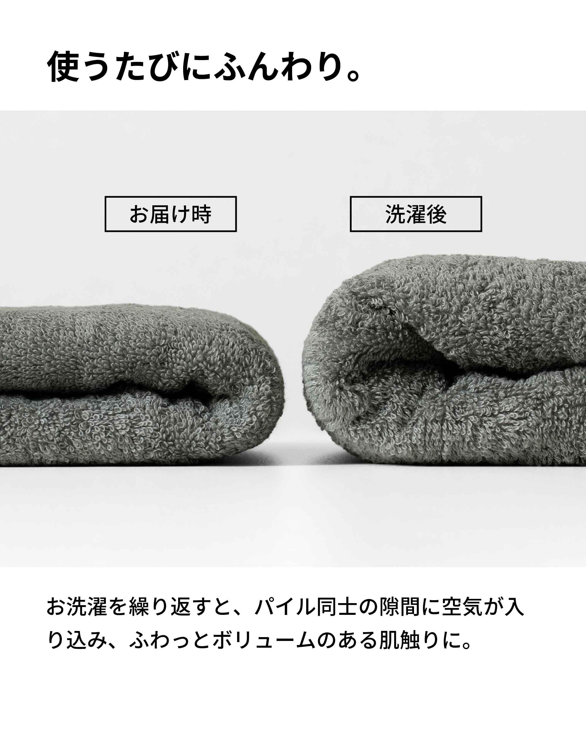 使うたびにふんわり。お洗濯を繰り返すと、パイル同士の隙間に空気が入り込み、ふわっとボリュームのある肌触りに。