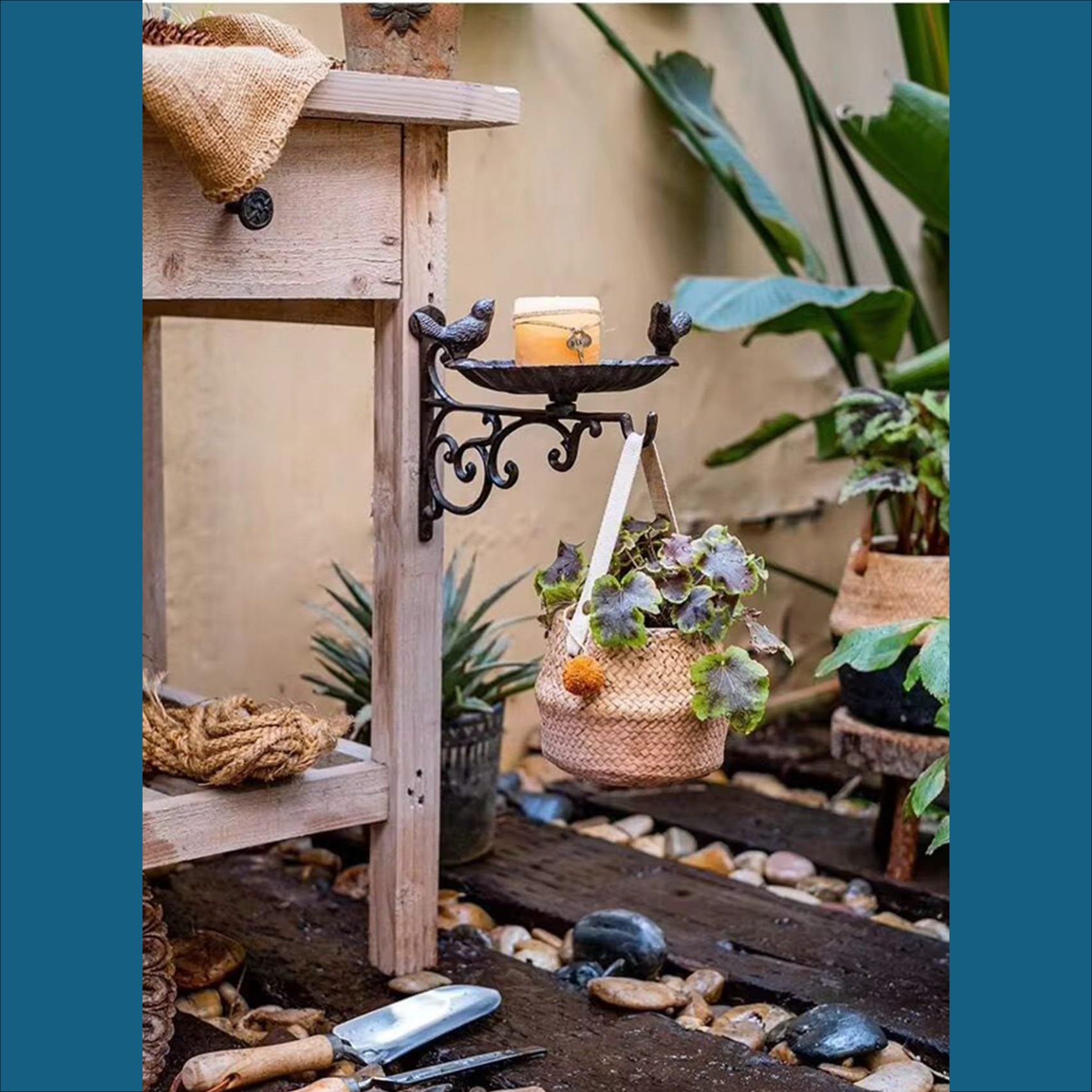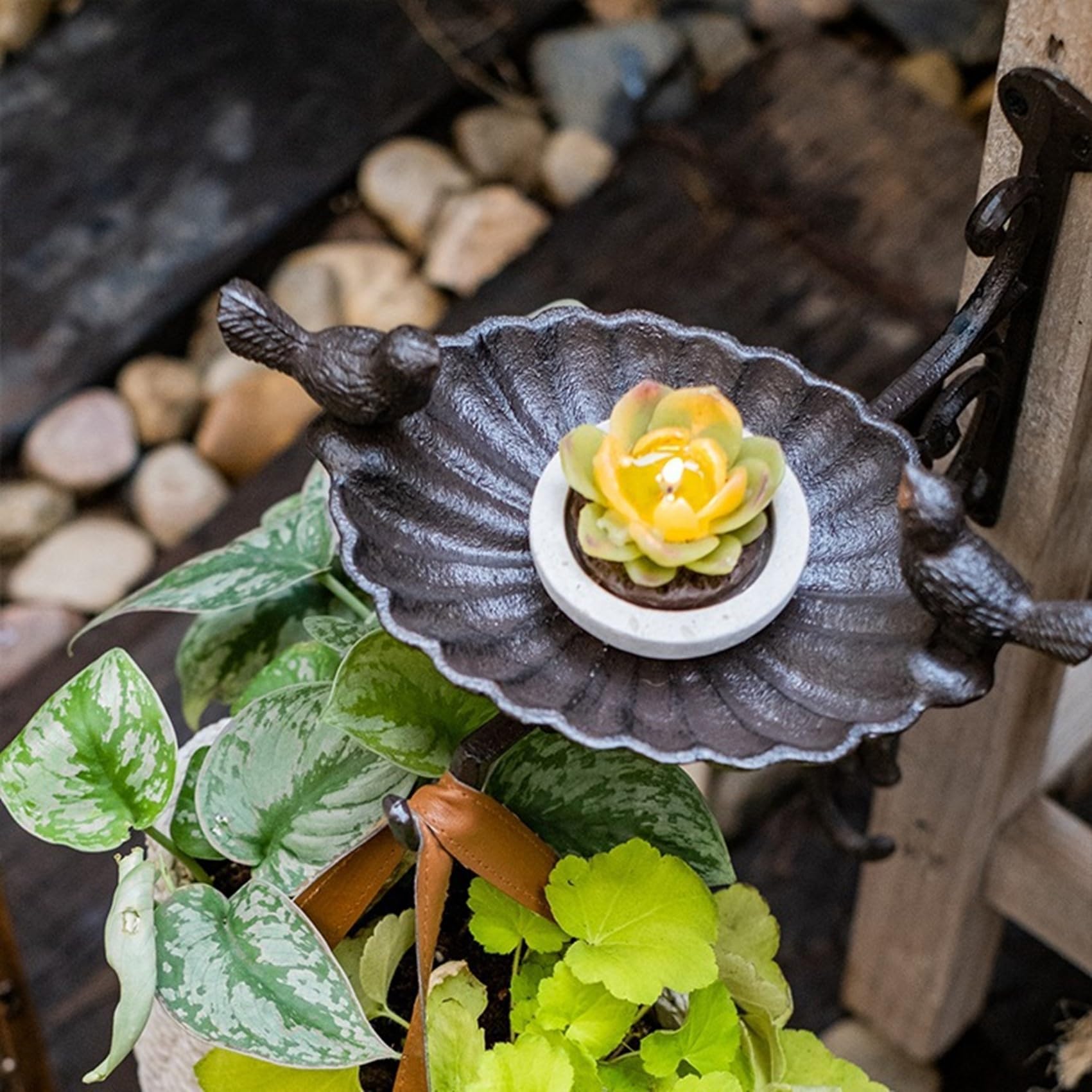 ガーデンオブジェには美しい二羽の鳥の彫刻が装飾されたアイアントレイが付いております。植物やオーナメントを飾ったり、ロウソクを設置したり自由に飾り付けをお楽しみいただけます。何も飾らずそのまま設置するのもシンプルでオシャレです。