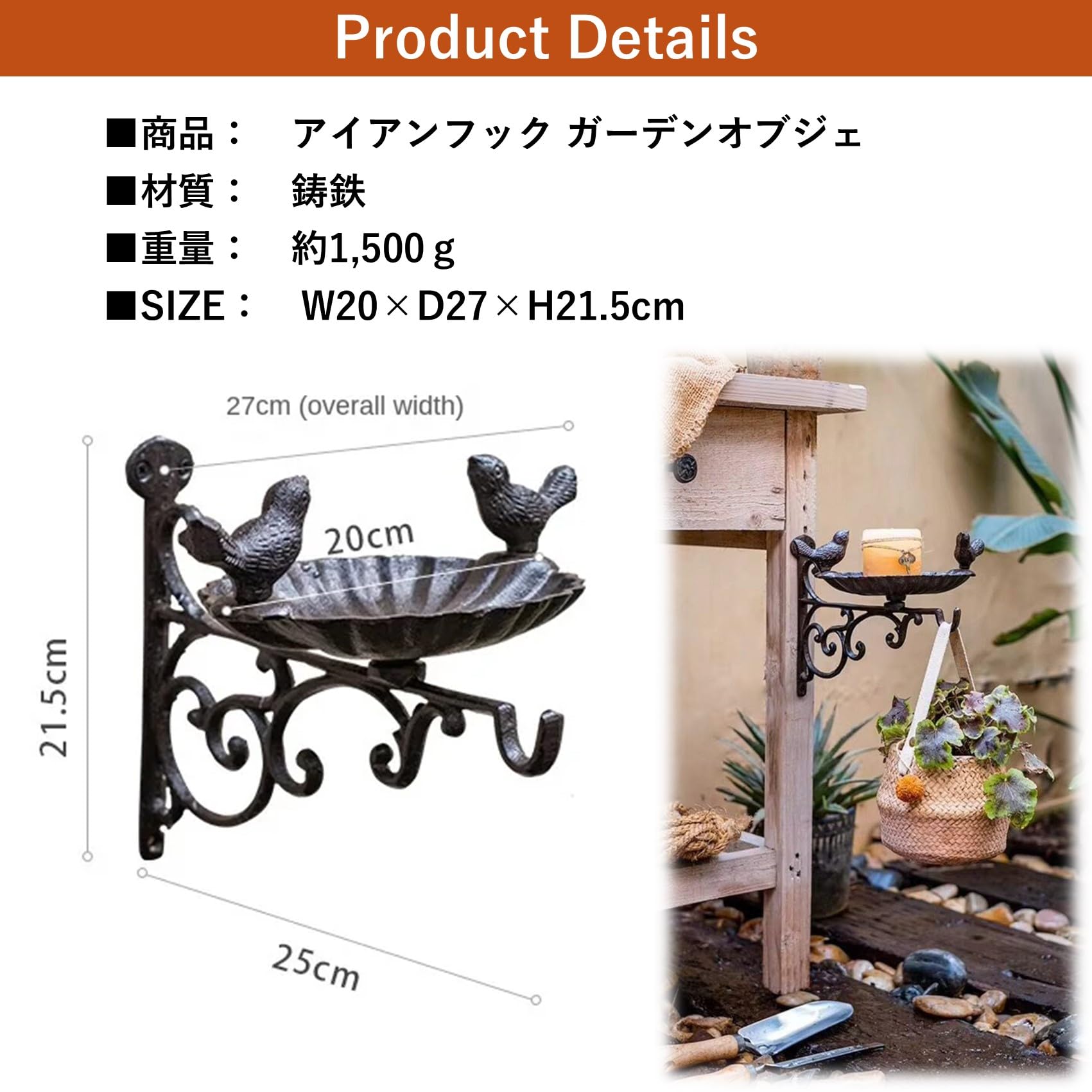商品詳細:アイアンフックガーデンオブジェ(設置用ネジ付属) 【材質】 鋳鉄 【SIZE】 W20×D27×H21.5㎝ 【重量】 約1,500g