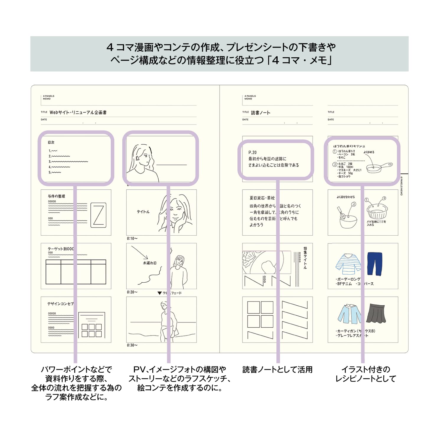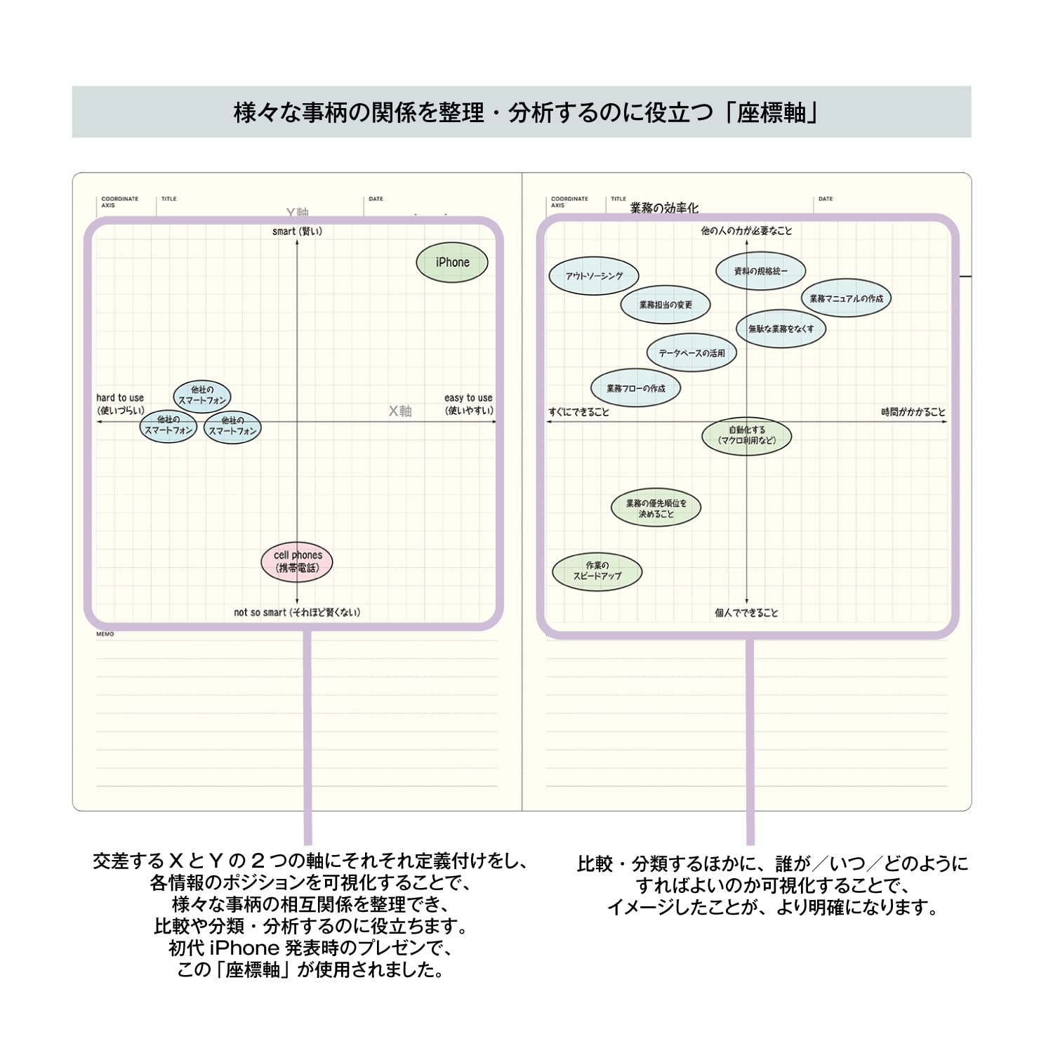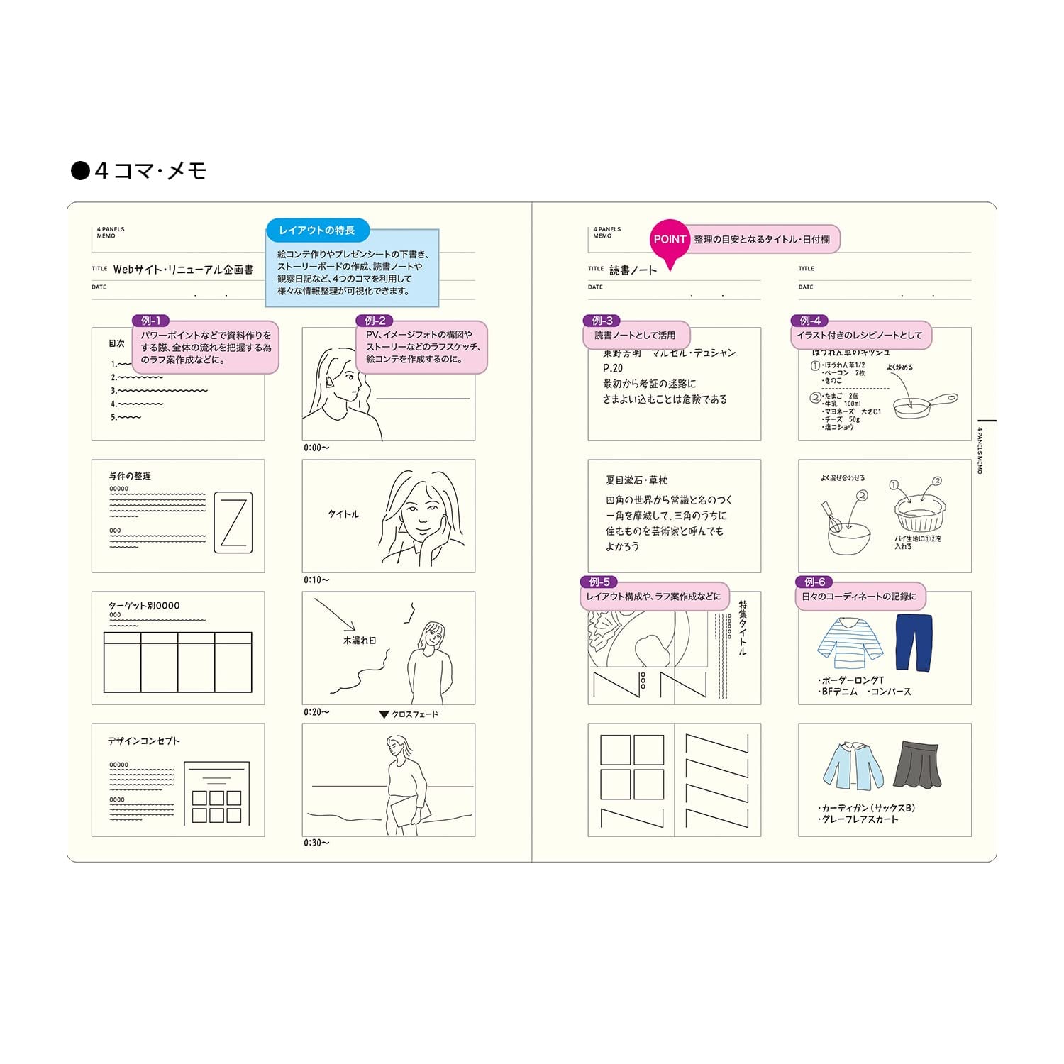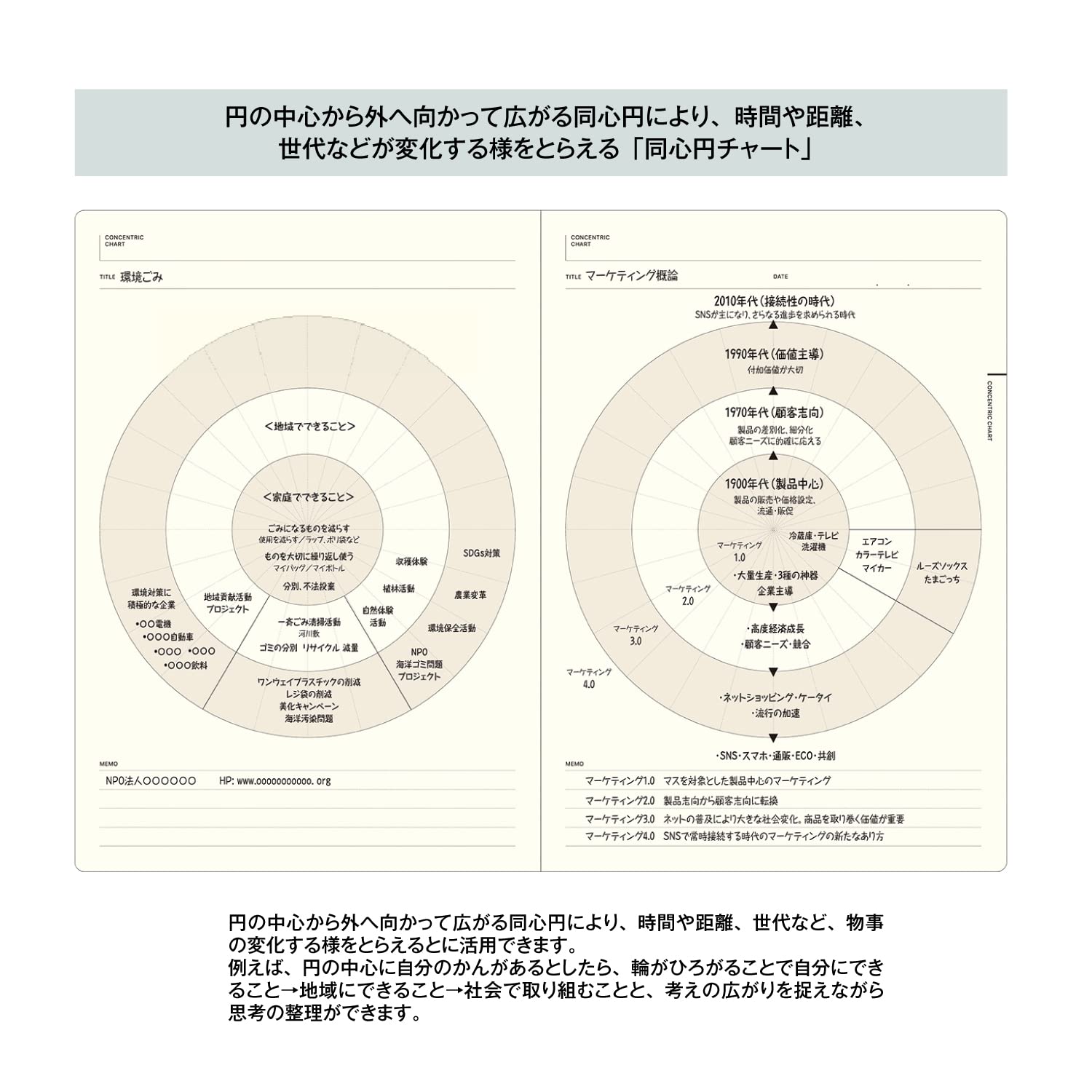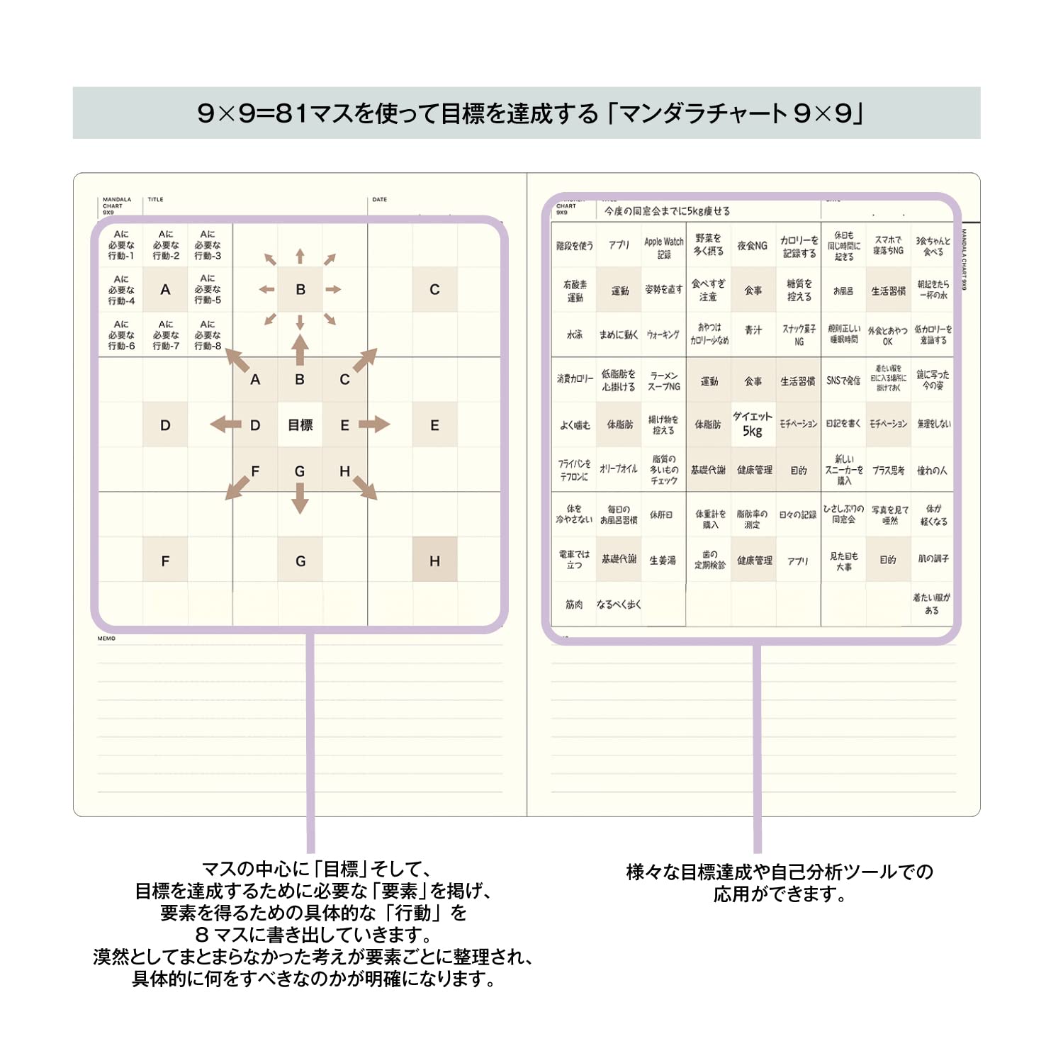 【内容】マンダラチャート16ページ、座標軸メモ16ページ、同心円チャート16ページ、4コマメモ12ページ