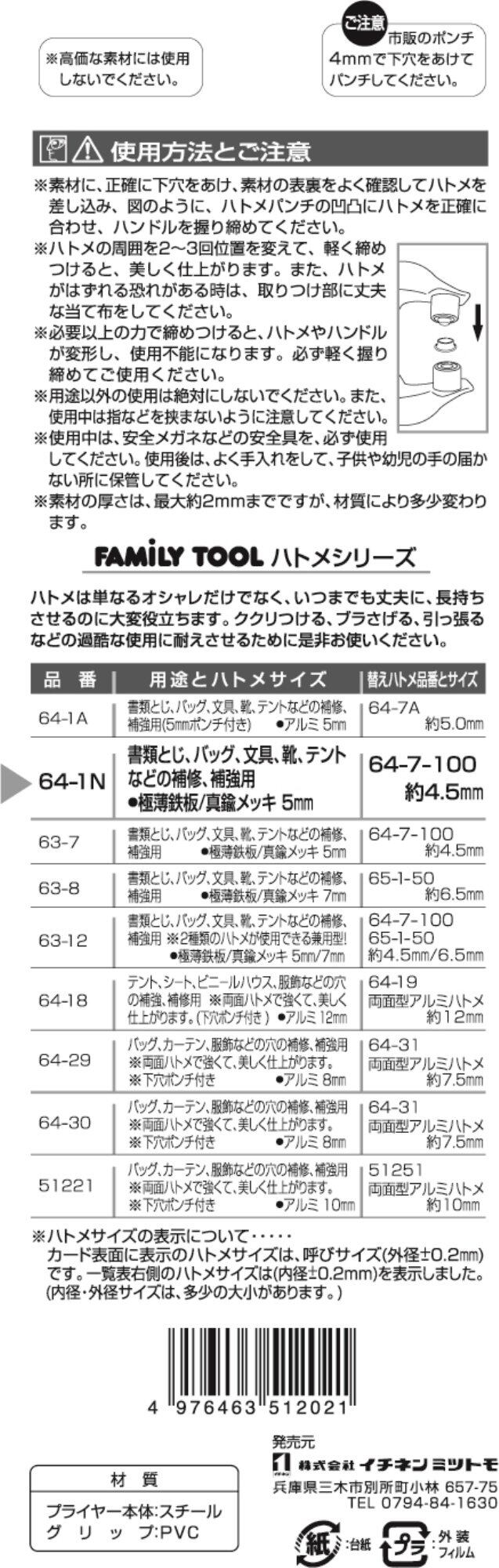 イチネンアクセス ツール事業部 イチネンアクセス FAMILY TOOL(ファミリーツール) ハトメ ハトメパンチ 5mm #5 64-1N 51202 ビニールグリップ