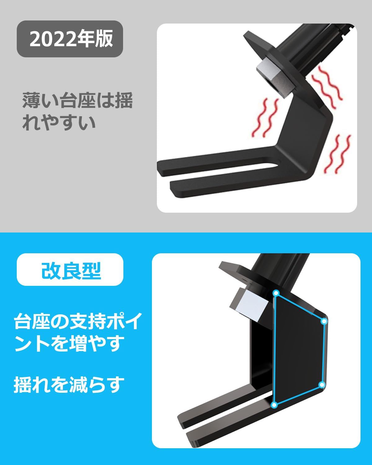 【安定性と耐久性】底面を補強し、製品ベースの支持点を増やすことで、ぐらつきを抑え、製品の安定性と安全性を向上させています。また、長さ500mmのシートボルト取り付け式タブレットホルダーは、頑丈なアルミニウム製グースネックアームで設計されている。 運転中のタブレットやスマートフォンを安定させます。