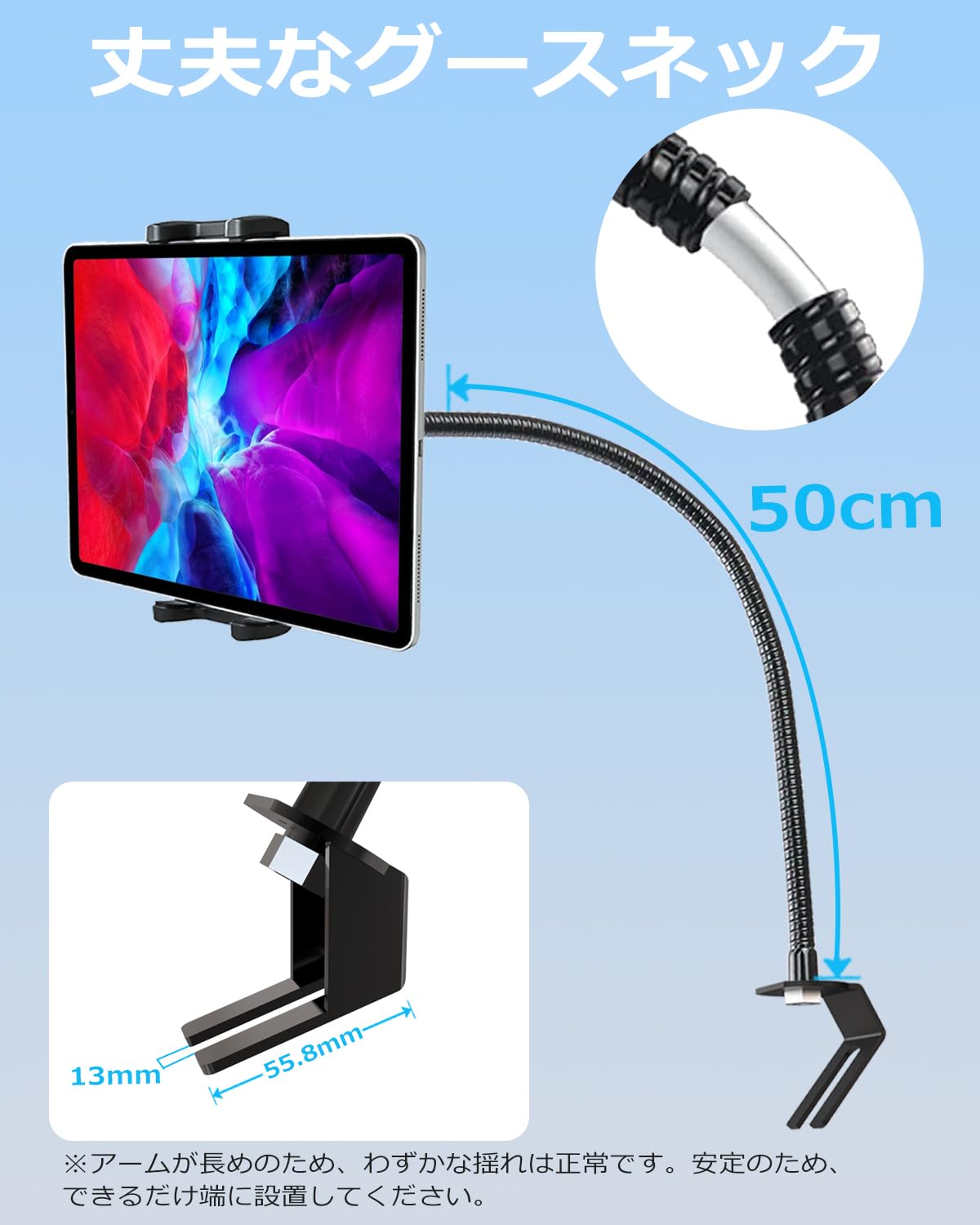 ※アームが長めのため、わずかな揺れは正常です。安定のため、できるだけ端に設置してください。