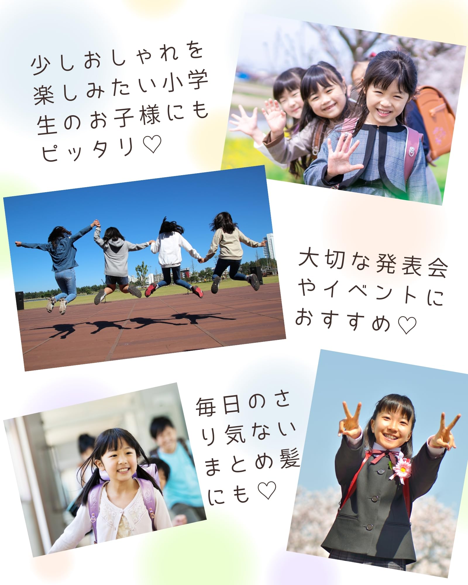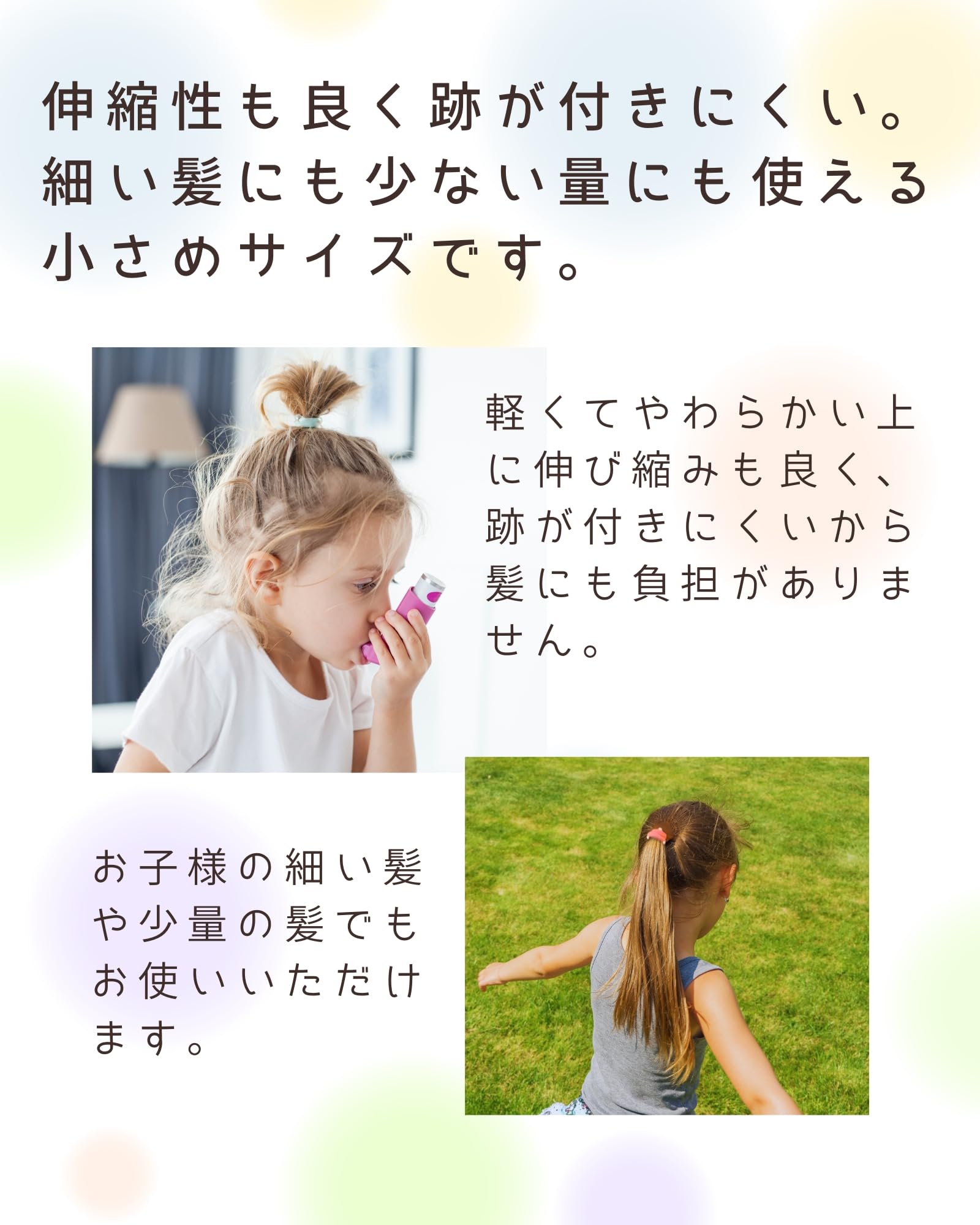 使いやすさ: お子様でも簡単に装着できる、適度な締め付け感のヘアゴムです
