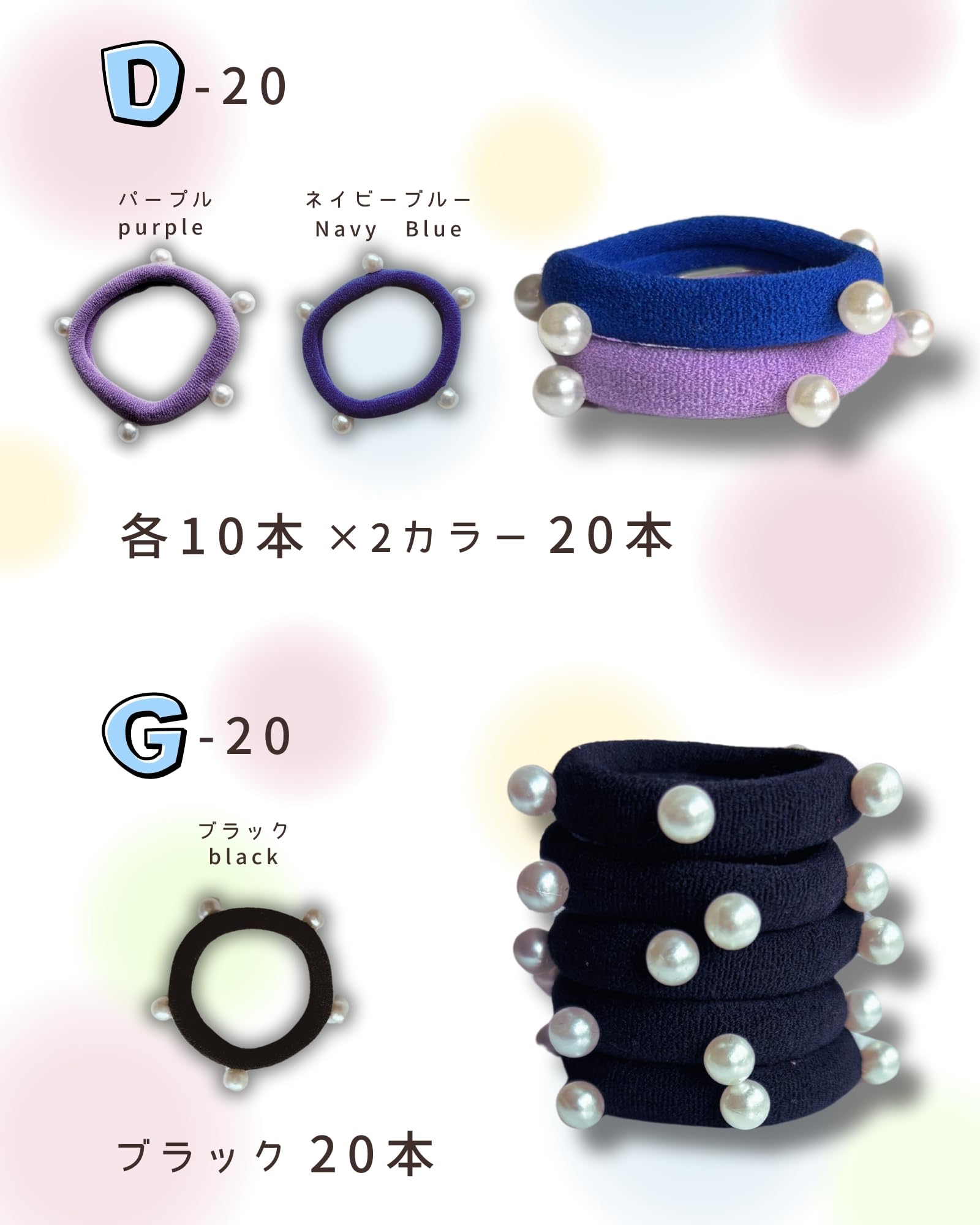 【努力特価】ヘアゴム 子供 20本入り パール 髪ゴム 切れない よく伸びる キラキラ イベント 小学生 かわいい ヘアアレンジ 紫 青 ゴム (D-20 20本セット)