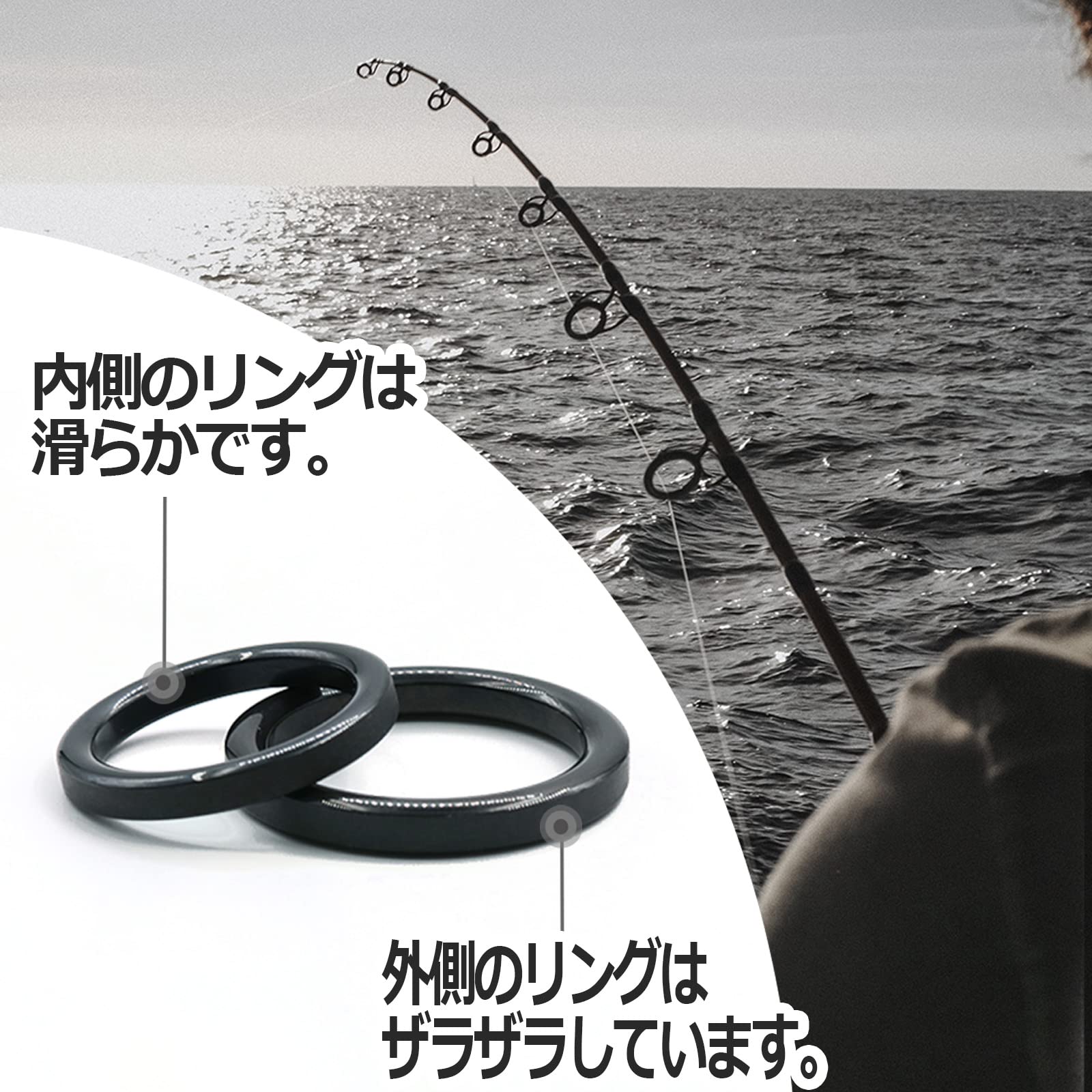 【釣り糸を守る】内輪が滑らかなセラミックリングは、磨耗による釣り糸の破断リスクを大幅に低減します。 外輪の表面が粗いため、取り付けが容易で、ガイドリングとより強固に密着し、簡単に脱落することはありません。