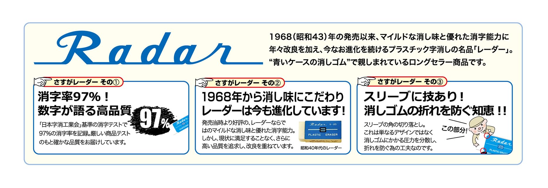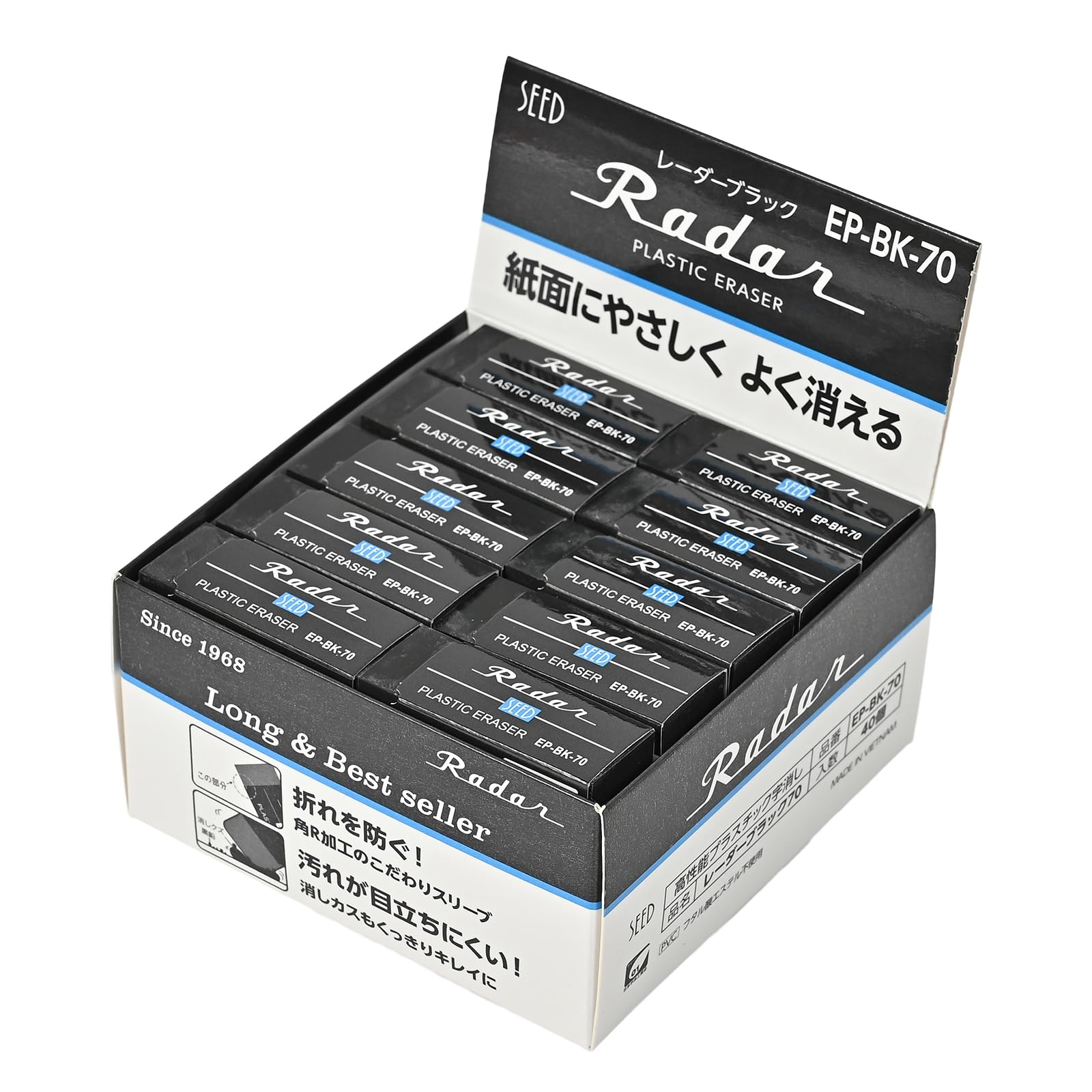 シード 消しゴム レーダー ブラック 70 40個 EP-BK-70-40P 【レーダー】1968年発売の「青いケースの消しゴム」で親しまれているロングセラー消しゴム 【特徴】特殊ワックス配合でサラッと軽い消しごこちを実現した汚れの目立ちにくい黒い消しゴム 【消しゴムサイズ】43×18×厚み12mm 【入数】40個 【材質】塩ビ製 マイルドな消し味と優れた消字能力はそのままの黒いレーダー消しゴムです。