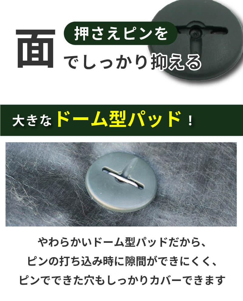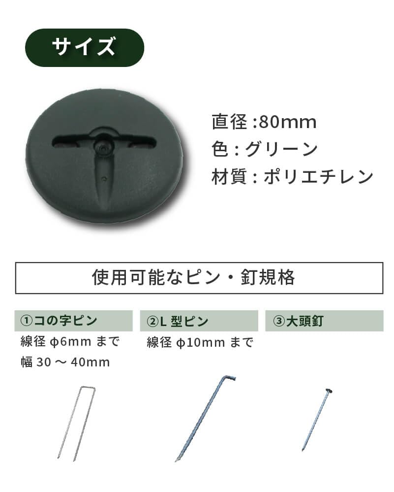■【特徴】シートグリップパッドはさまざまなピン・釘に対応した、防草シートなどの押さえ板です。コの字ピン・U字ピン・L型ピン・大頭釘など多様な押さえ具に対応!様々な現場で活躍します。押さえ板には穴が開いていないため、隙間から雑草が生えません。