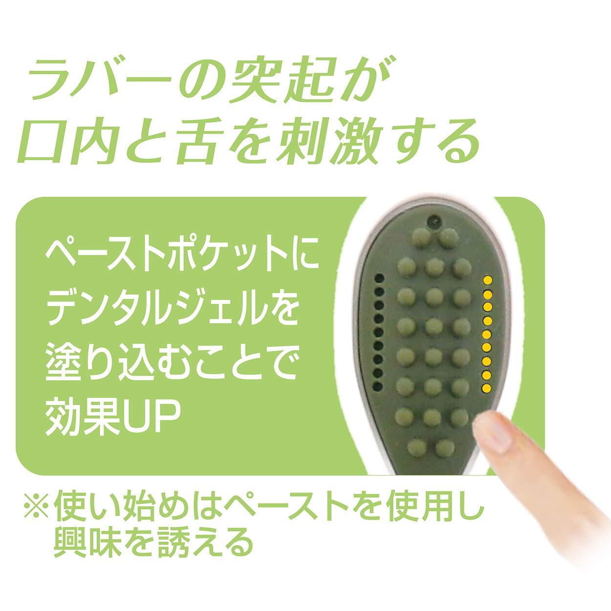 ラバーの突起が口内と舌を刺激する。ペーストポケットにデンタルジェルを塗り込むことで効果UP。遊びながらお口の健康を維持
