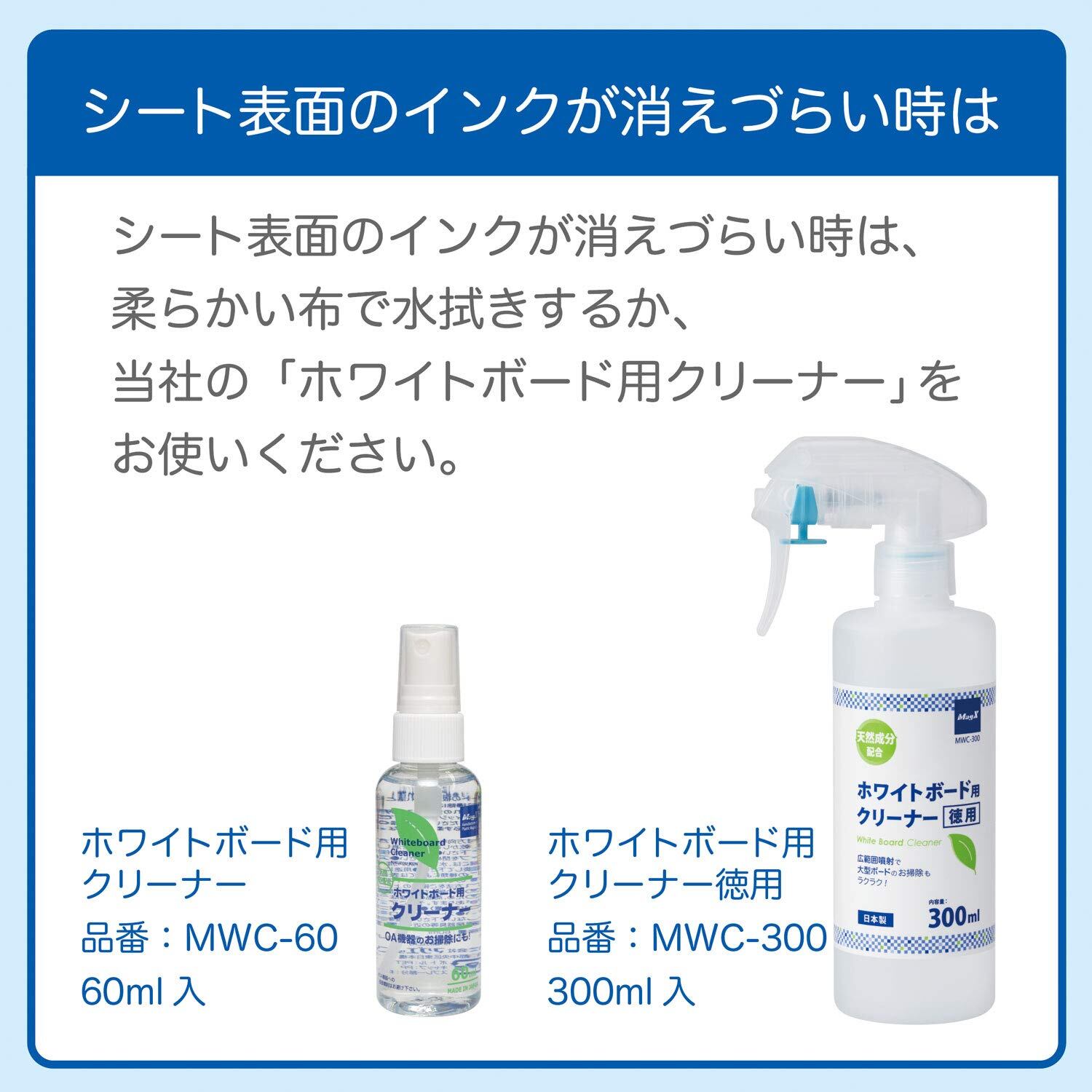 ※2.消えにくい場合:ホワイトボード用クリーナー(別売/MWC-60・MWC-300)を使用。