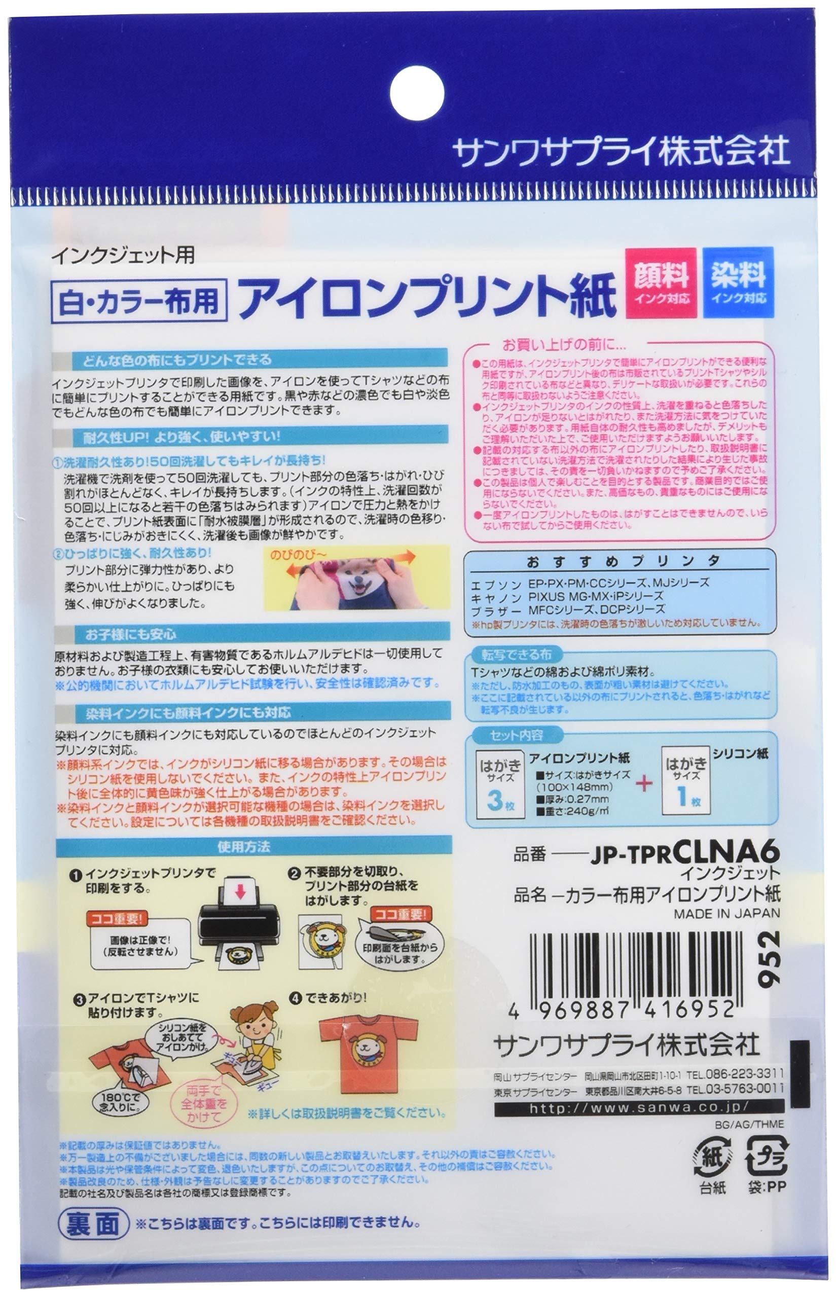 サンワサプライ インクジェットカラー布用アイロンプリント紙 JP-TPRCLNA6