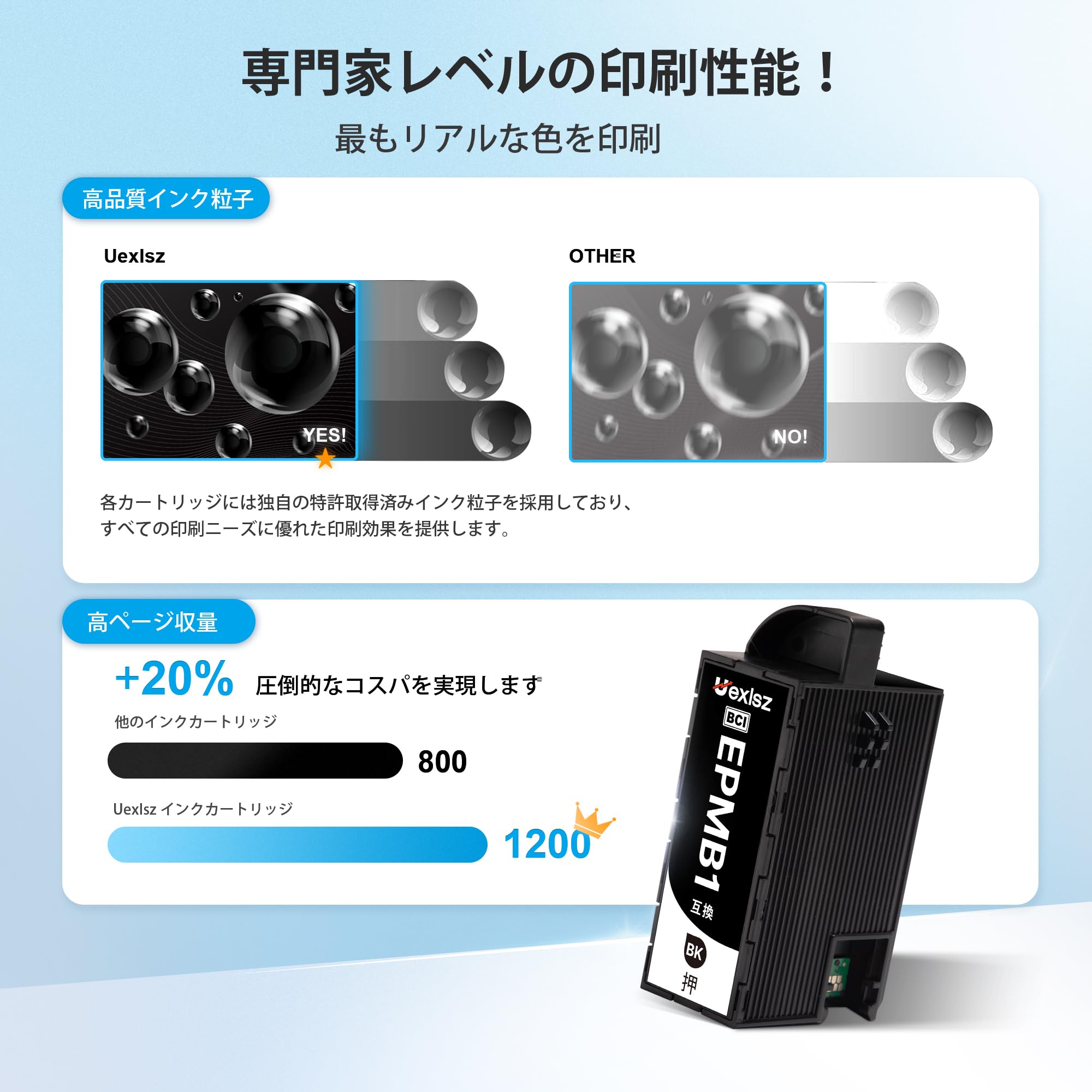 【高いクオリティ】:EPSON対応 EPMB1 純正品の特性(形状、インク容量、使用方法同じ)の上で、メッセージ表示機能搭載だけでなく、業界大手製の最新バージョンのICチップを採用し、低コストで高い安定性を実現します。