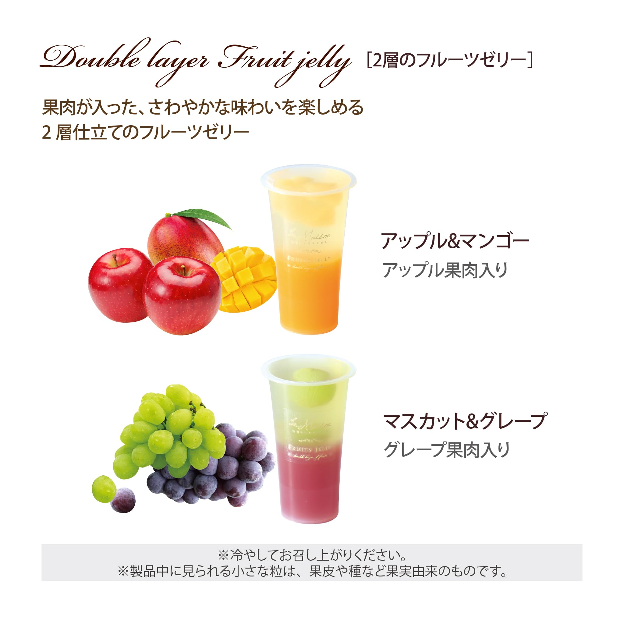 2種類のフルーツのゼリーを2層仕立てに。フルーツの果肉が入った、さわやかな味わいが楽しめるゼリー。 見た目にも華やかなゼリーは贈り物にもおすすめです。 常温で保存できますが、冷蔵庫などでよく冷やしてお召し上がりください。