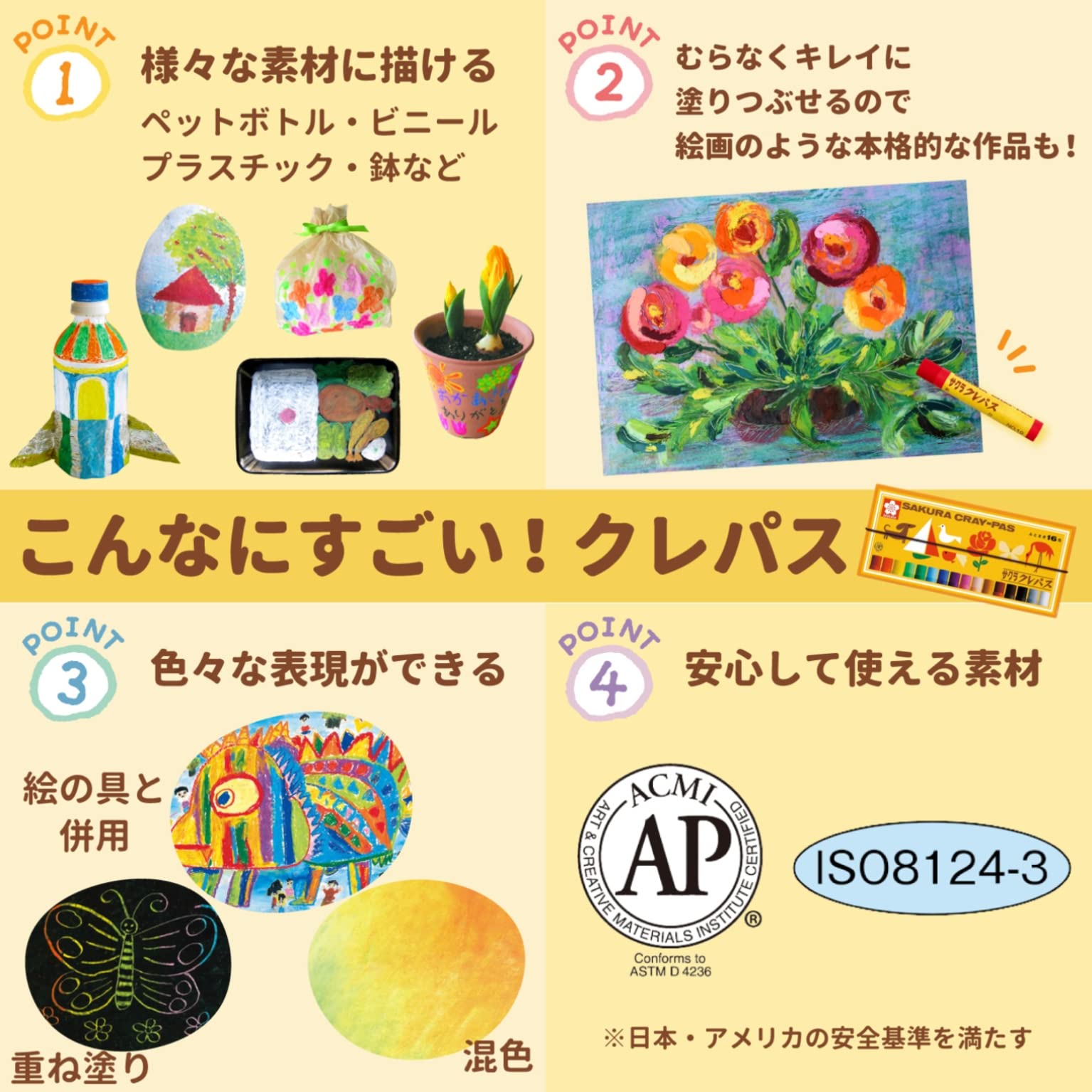 ●のびのびと自由に描けるように作られています●均一なやわらかさなので、混色・重色が自由に出来ます。●子供たちの手に合わせた太さとやわらかさを兼ね備えていますので、折れにくく、面塗りも線描きも自由自在です。
