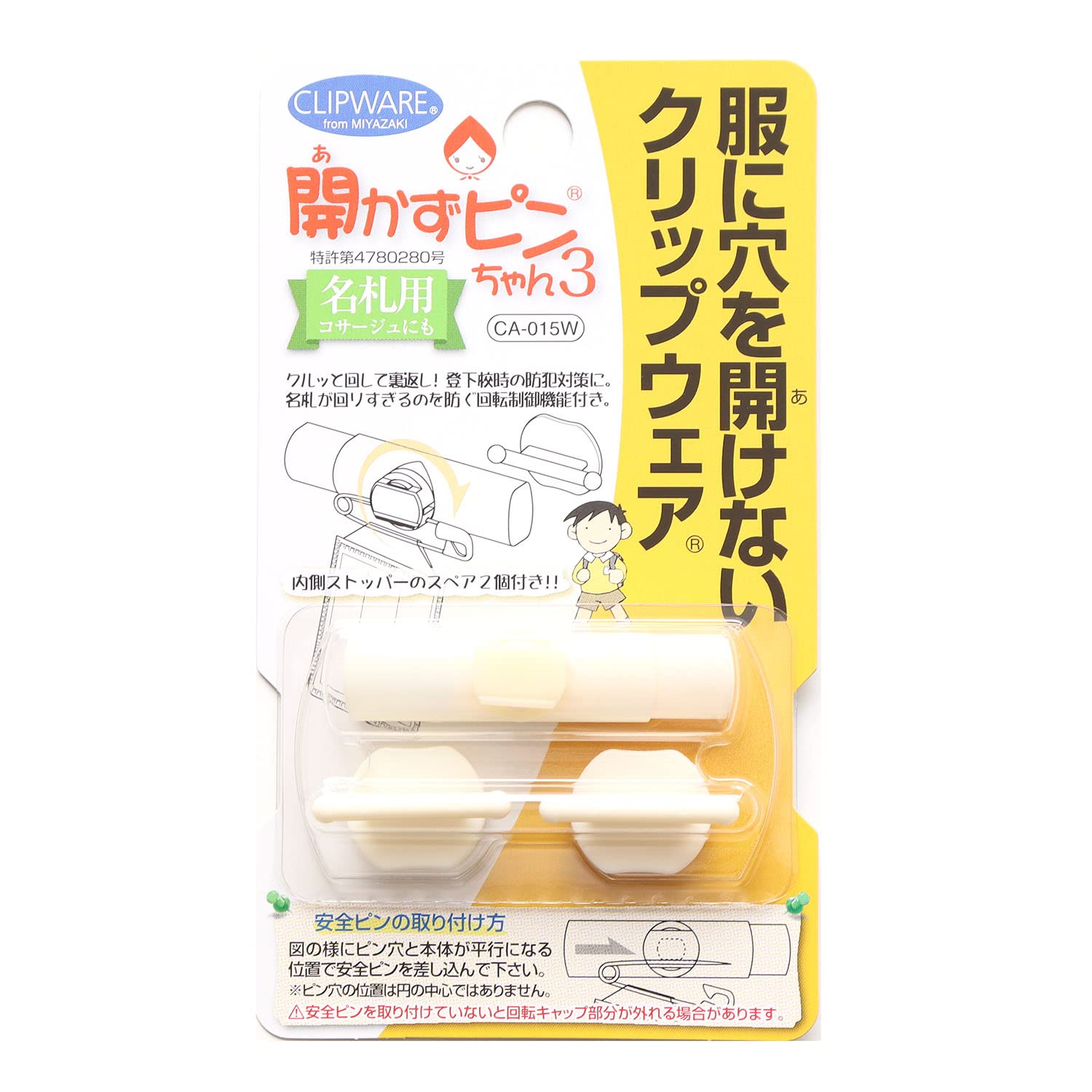 クリップウェア 開かずピンちゃん3 ホワイト CA-015W マイナーチェンジ!回転部分の強度アップ! 服に穴を開けないで名札等の取り付けができる開かずピンちゃん3です。内側ストッパーのスペア2個付き。 クルッと回して裏返し!登下校時の防犯対策に。名札が回りすぎるのを防ぐ回転制御機能付き 名札 ・ コサージュ 用 服に穴を開けない / 日本製 色:ホワイト 服に穴を開けないで名札等の取り付けができる開かずピンちゃん3です。内側ストッパーのスペア2個付き。