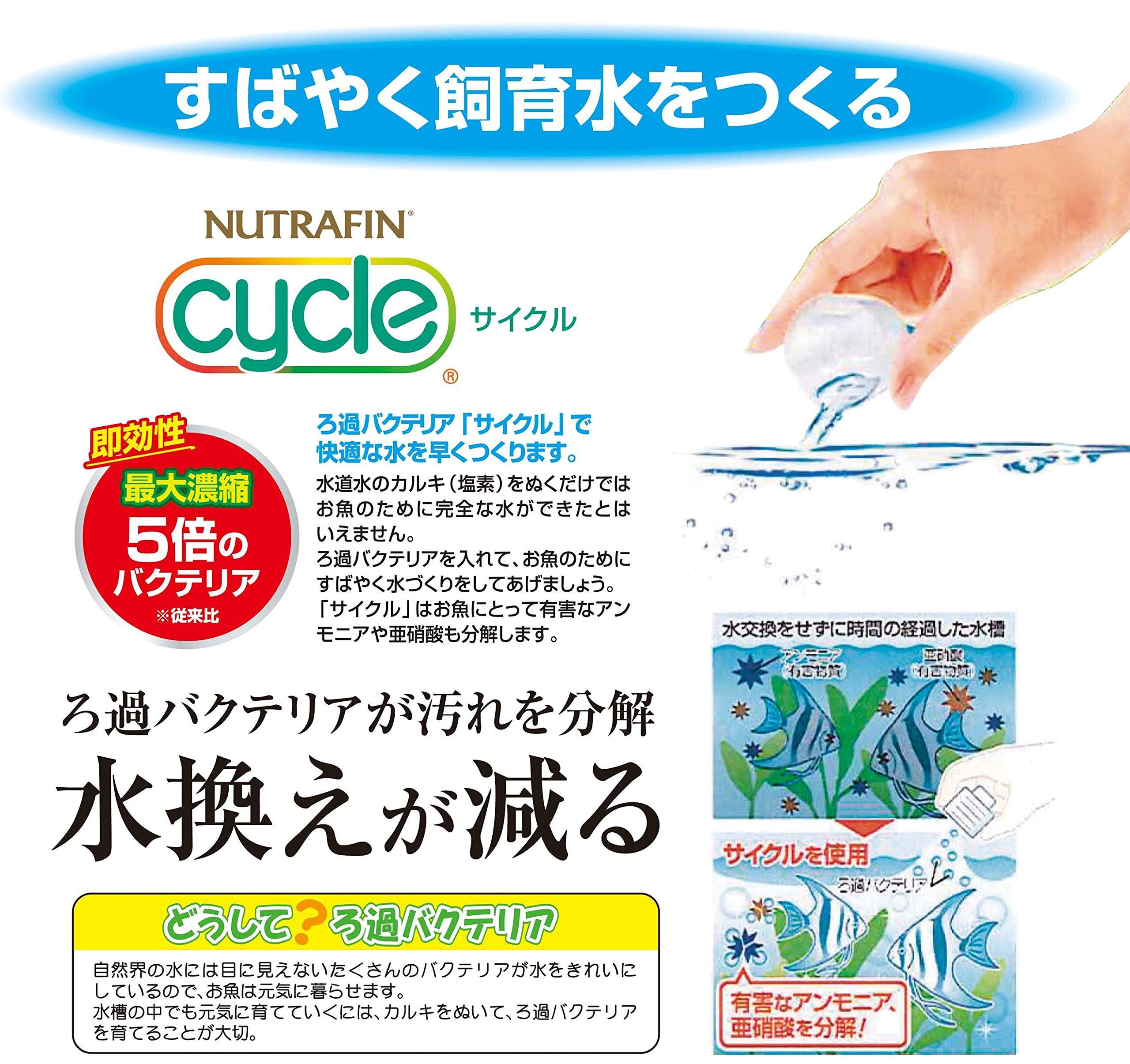 生きているろ過バクテリアですばやい水づくり! 従来品と比べバクテリアが5倍の高濃度なので少しの量でしっかり効き、たっぷり使える! すばやく活動を開始する5種類のバクテリアと従属栄養細菌の究極の組み合わせはサイクルだけ! 生物ろ過の決定版。魚にとって有害なアンモニア、亜硝酸を分解・除去。5倍濃度の生きたろ過バクテリアでより素早く水を作る。生物ろ過を促進し、水のバランスを整え、魚の健康を長く維持。飼育水をすばやく安定させ、ニオイのない輝く澄んだ水をつくります。 砂利の汚れ、沈殿物を分解・除去する「ベストバイオ」と生きているバクテリア「サイクル」を併用することで更にきれいな水づくりを実現できます。 便利な計量カップ付。