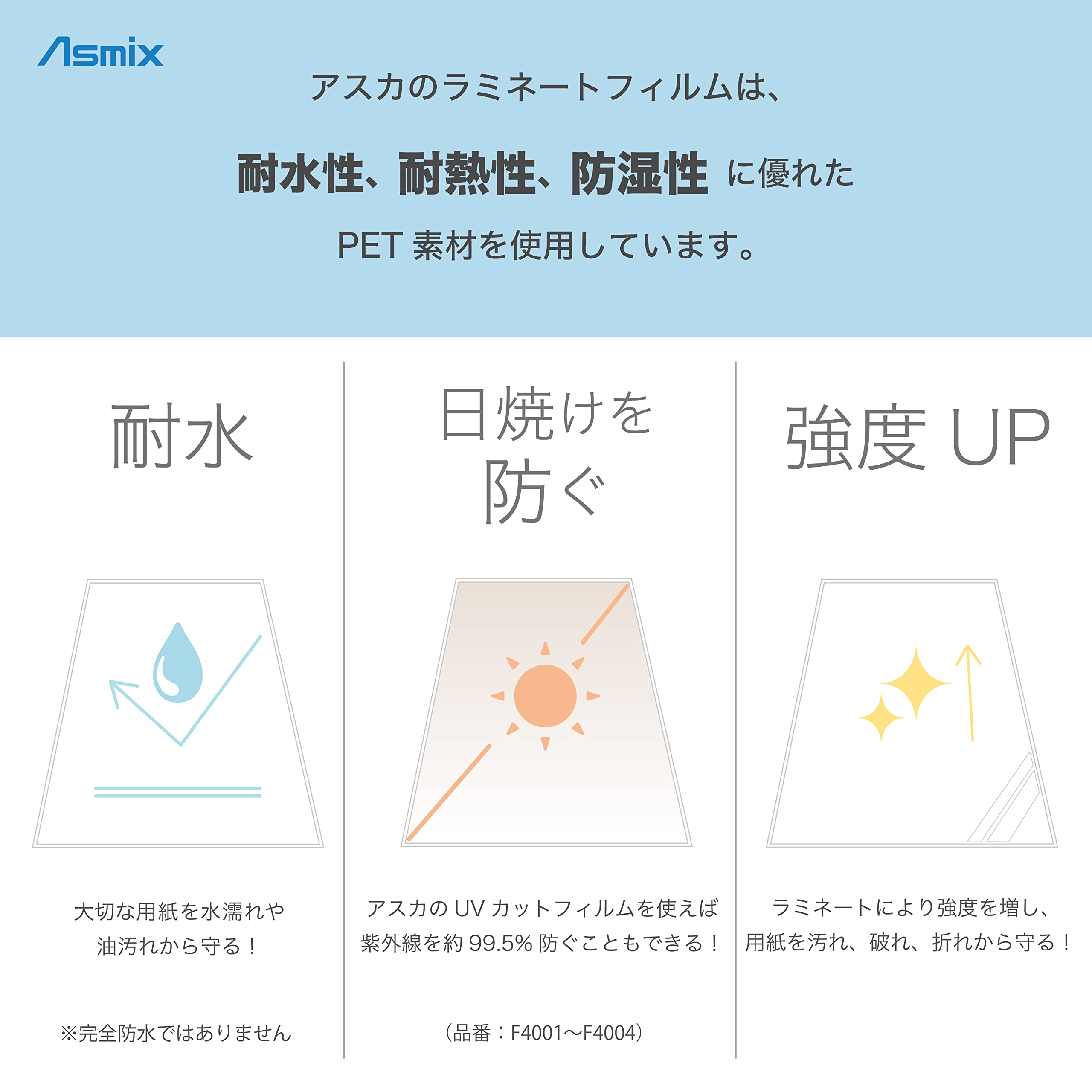 アスカ Asmix ラミネートフィルム 写真2Lサイズ F1024 静電防止 100枚入り 100μ ゴミやほこりがつきにくいラミネーター専用フィルム 静電防止フィルムだから原稿がスムーズに入れられる フィルムサイズ:写真2L判(B6) 134×188mm フィルム厚:100? フィルム入り数:100枚 ●ほこり、ゴミが付きにくいスタンダードな静電気防止フィルムです。