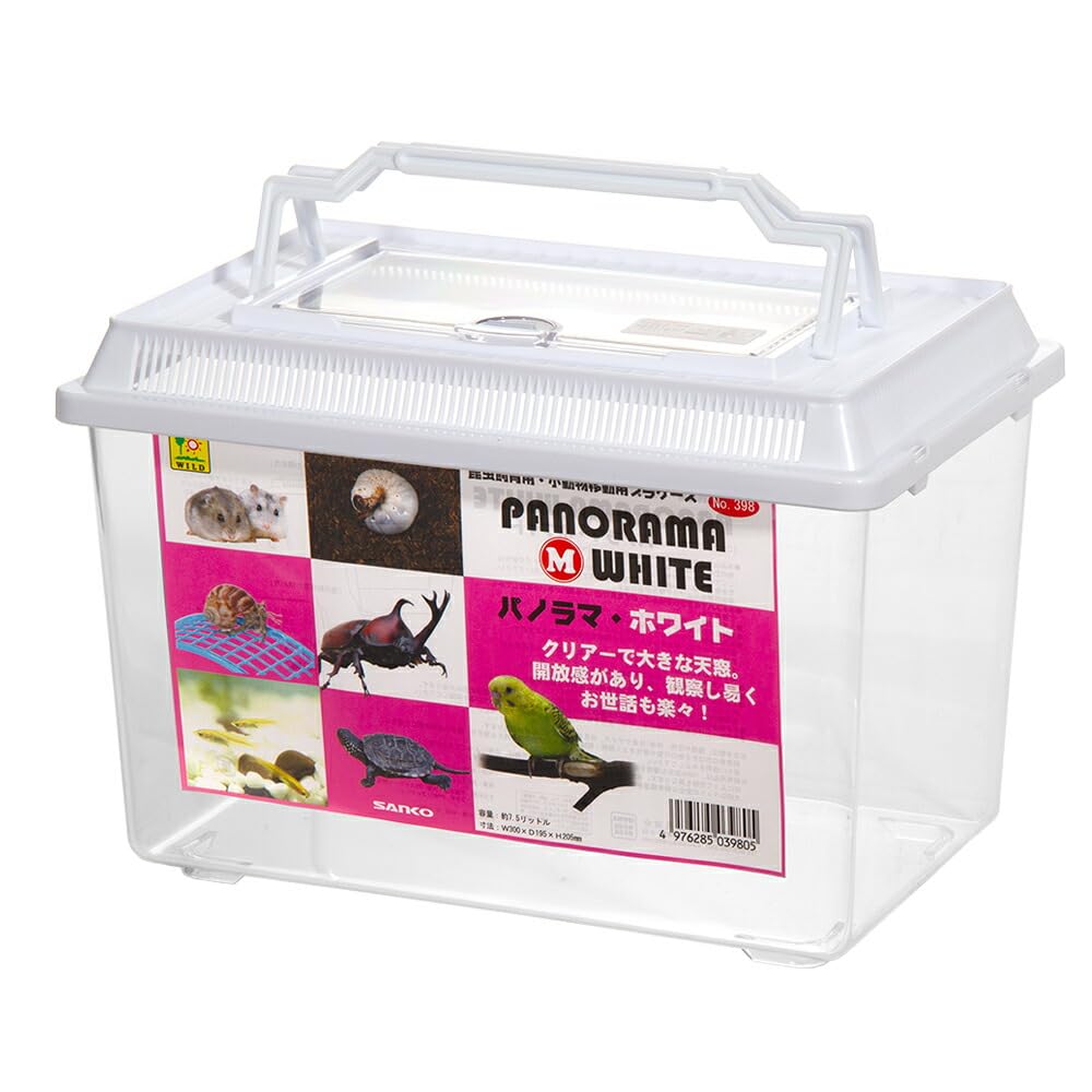 三晃商会 SANKO 398 パノラマ M ホワイト 本体サイズ (幅X奥行X高さ) :30×19.5×20.5cm 本体重量:600g 原産国:中華人民共和国 原材料:下部本体、天窓:PSスチロール樹脂 フタ部:PPポリプロピレン クリアーで大きな天窓。開放感があり観察しやすくお世話も楽々 原材料・成分 下部本体、天窓:PSスチロール樹脂 フタ部:PPポリプロピレン