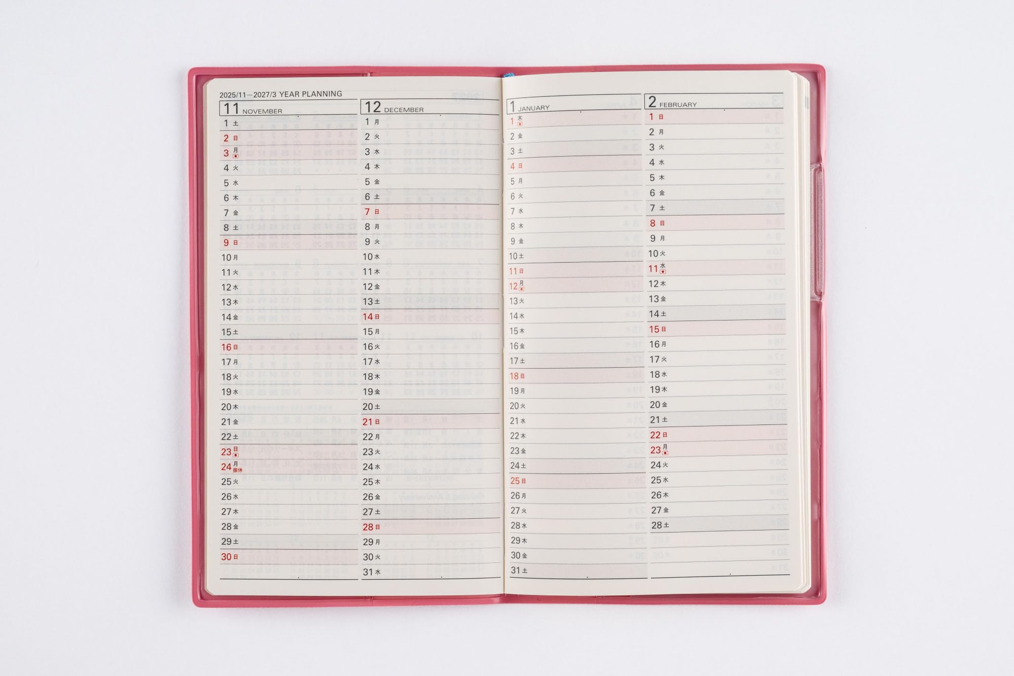 【商品詳細1】サイズ:幅9.6×高さ16.3cm 【記入欄】●月間ページ…ブロック式(土日均等の記入欄) ◇日曜始まり 【掲載期間】月間ページ:2025年11月1日〜2027年3月31日