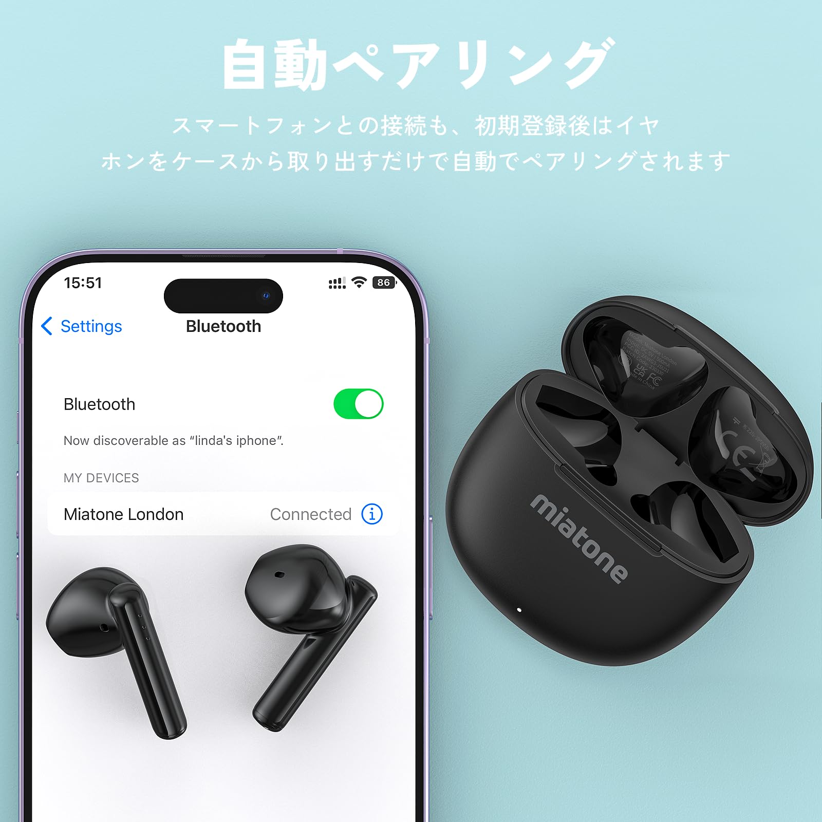 Bluetooth5.3 & 自動ペアリング:最新のBluetooth5.3を採用し、従来よりも接続の安定性・速度・省電力性が向上。初回設定後はケースから取り出すだけで瞬時に自動接続され、遅延や音切れを大幅に軽減します。
