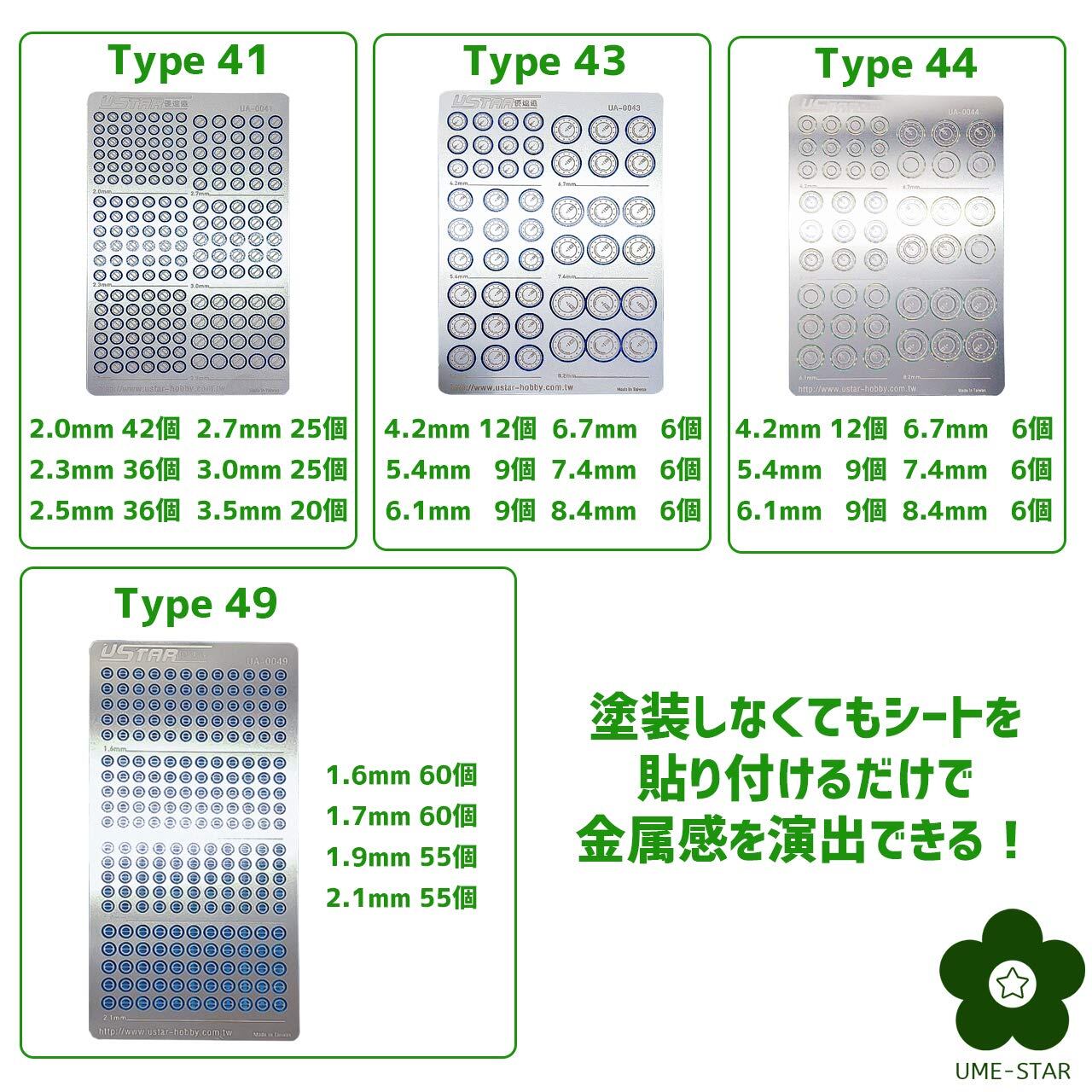 1つのシートに多くの種類、大きさのパーツがありますので、ご確認の上タイプを選択してください。
