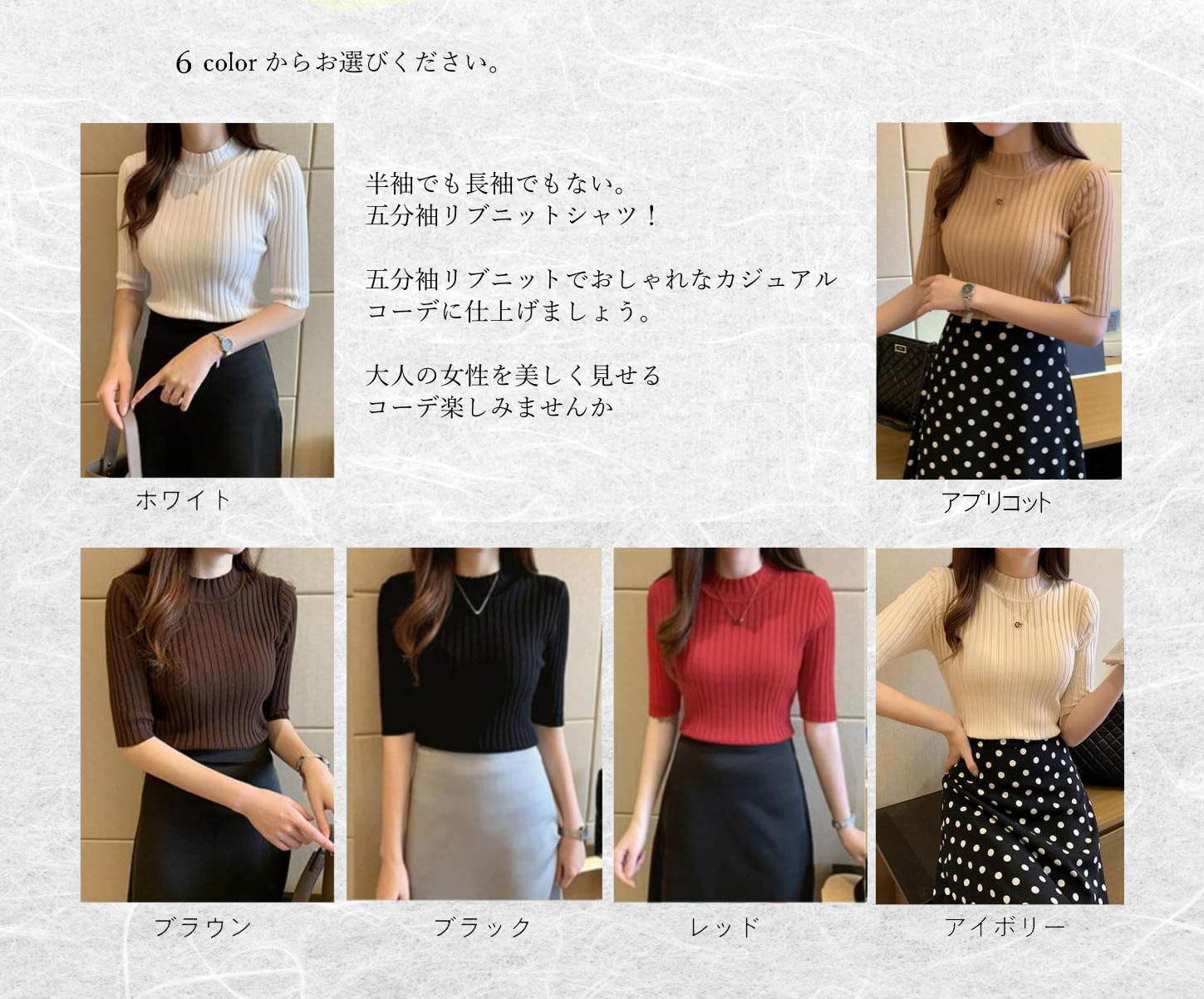 5分袖のプルオーバーリブニットです。ベーシックな5色のカラーからお好きな色がお選び出来ます。着回し力抜群のカジュアルトップスです。