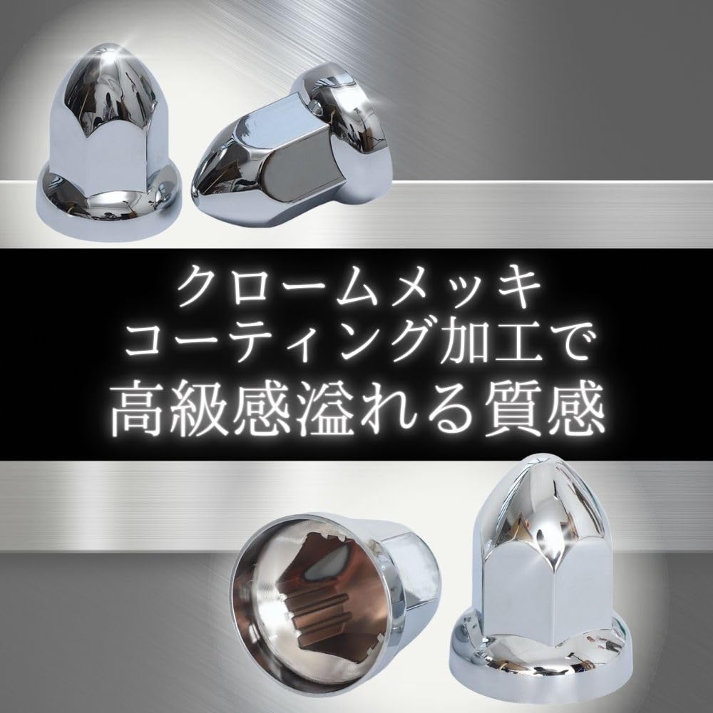 ◆ ・仕様:大型ISOホイール10穴用(JISホイール(ナット41mm)取り付け不可です。) ・材質:ABS(クロームメッキ仕上げ) ・カラー:クロームメッキ ・サイズ(約):33mm 高さ55mm