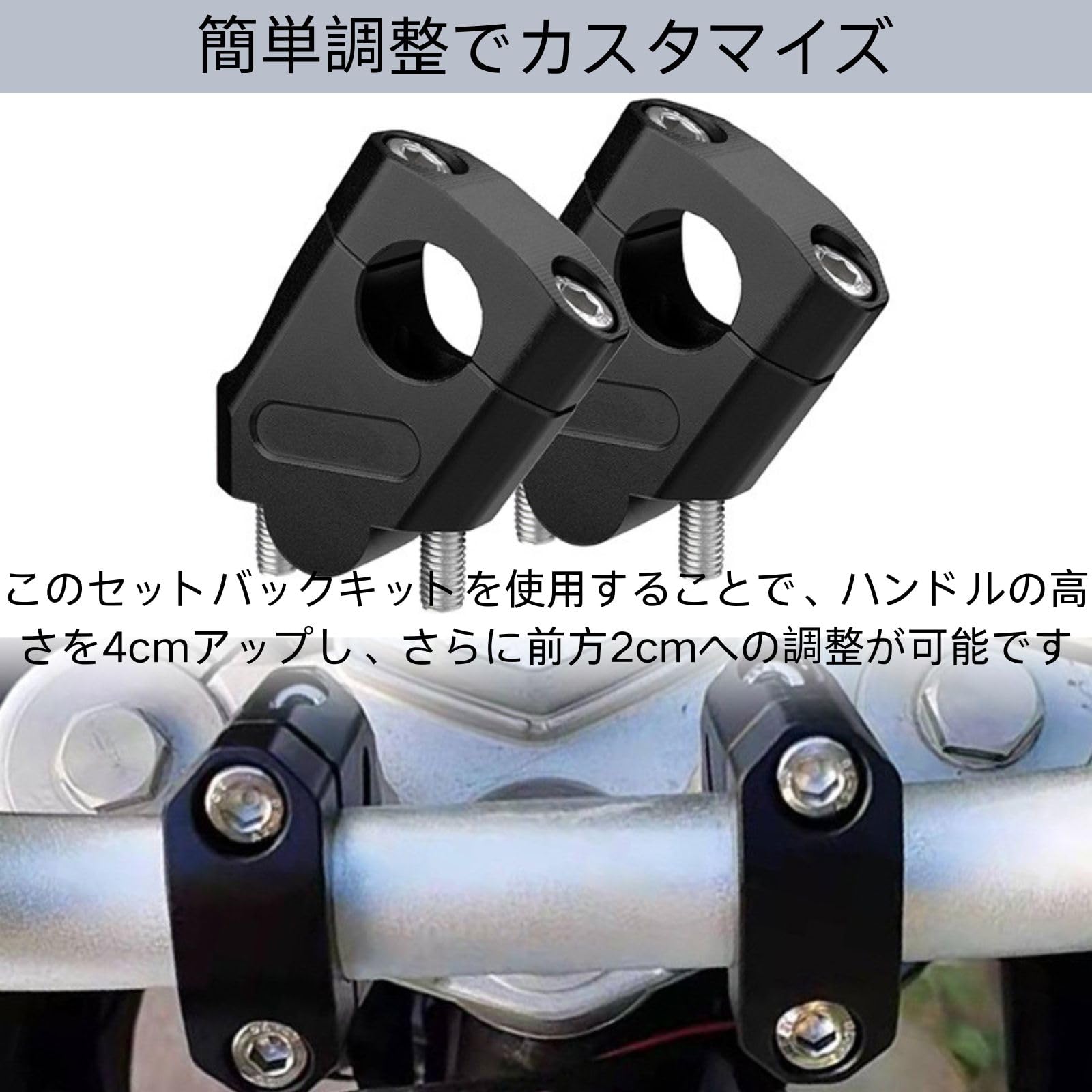 簡単調整でカスタマイズ:このセットバックキットを使用することで、ハンドルの高さを4cmアップし、さらに前方2cmへの調整が可能です。ライディングポジションを自分好みに変更し、快適な運転をサポートします。