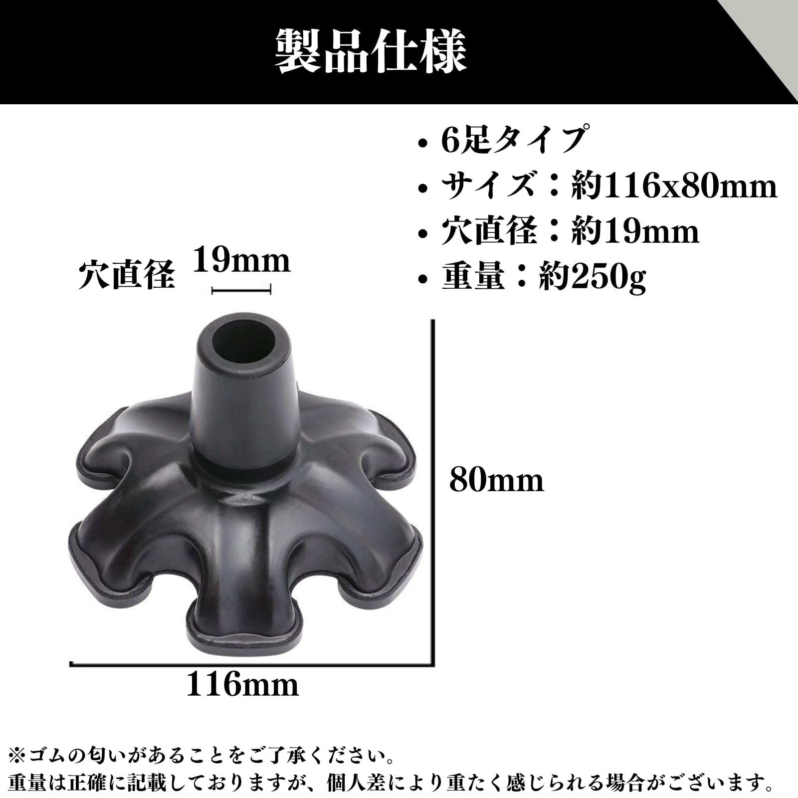 【製品仕様】●6足タイプ ●サイズ:約116x80mm ●穴直径:約19mm ●重量:250g ●素材:ゴム ※ゴムの匂いがあることをご了承いただければ幸いです。重量は正確に記載しておりますが、個人差により重たく感じられる場合がございます。