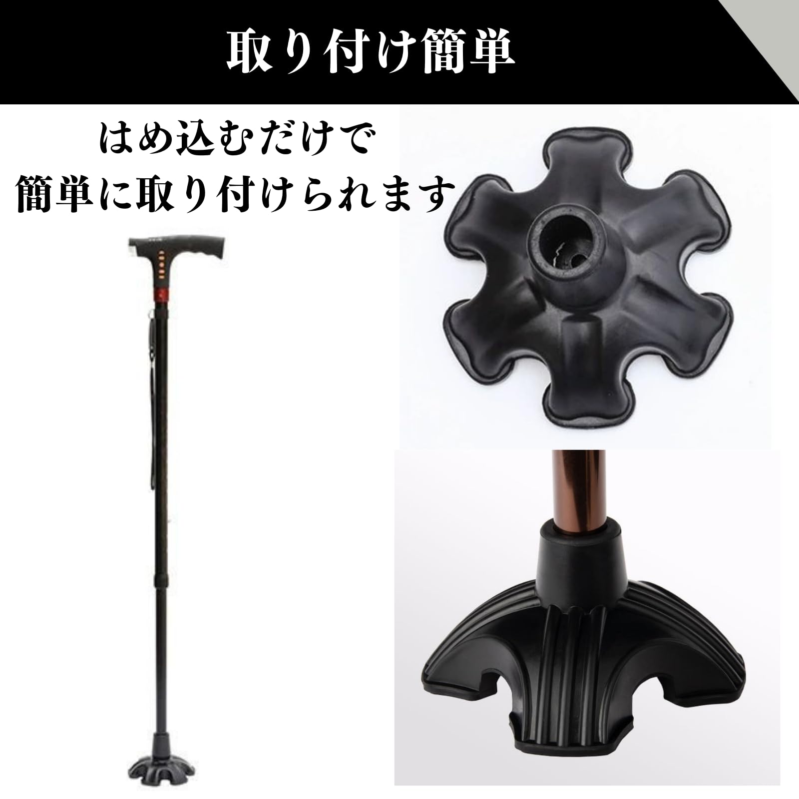【取り付け簡単】先端部分にキャップのようにはめ込むだけで簡単に取り付けができます。雨や泥からも杖を守ります。
