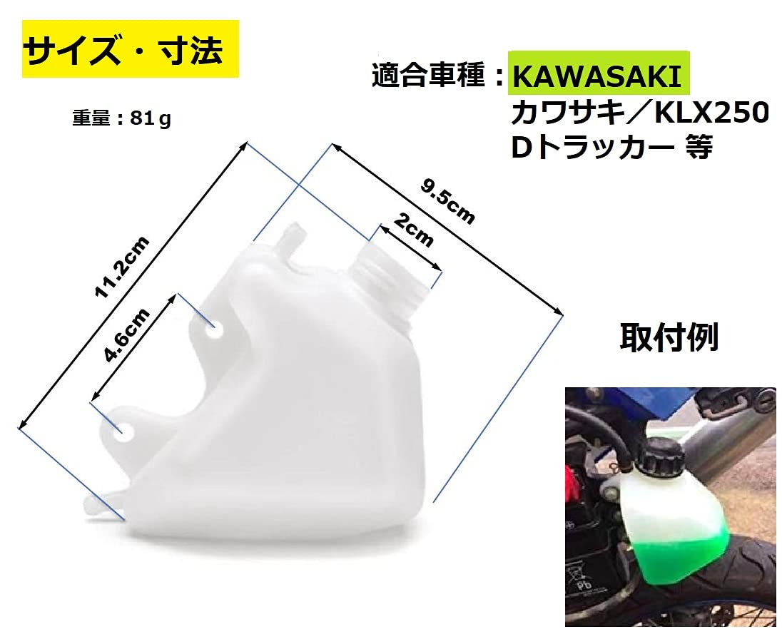 【仕様】サイズ:タンク/全長:11.2cm、幅:9.5cm、高さ:8.2cm、取付穴ピッチ:4.6cm、注口内径:2cm(キャップの付属なし)、材質:ABS、重量:81g、カラー:ホワイト、適合車種:カワサキ KLX250 Dトラッカー 等