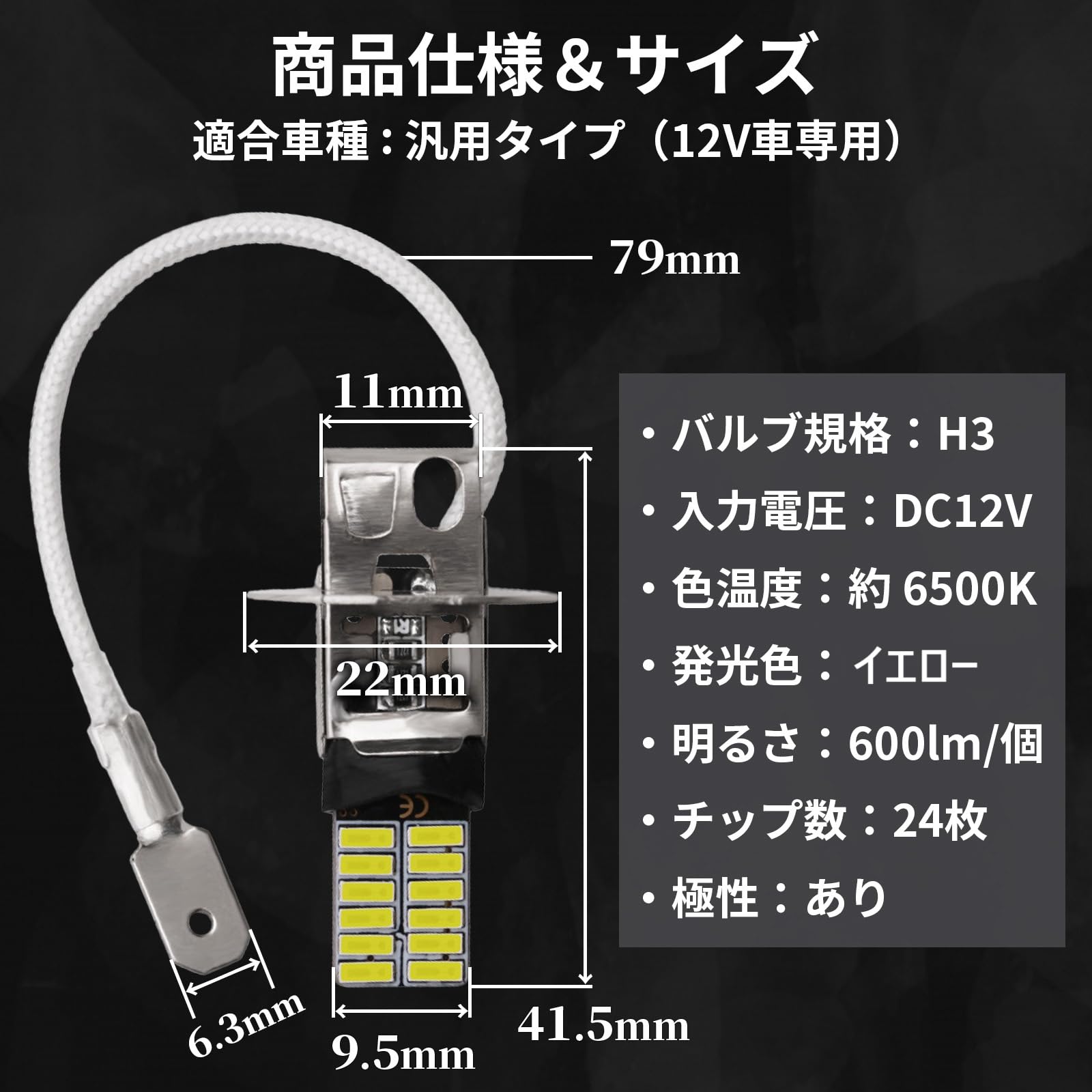 【小型ショートタイプのH3 LEDフォグランプ】 本製品は、汎用タイプのH3 LEDバルブです。12V車に対応し、ハロゲンバルブからの交換用としてご利用いただけます。ショートサイズの小型設計で取り付けやすく、限られたスペースでも干渉の心配がありません。フォグランプはもちろん、デイライトや補助用のヘッドライトにも適しています。 【高輝度両面発光・安定した明るさを確保】 24枚の4014型LEDチップを採用し、片側600lmの高輝度を実現。両面発光設計により、広範囲に均一な照射が可能です。暗所や悪天候時でも視認性を高め、安全な走行をサポートします。フォグランプやリバースランプ、ブレーキランプなどにも対応可能な設計です。 【発光色イエロー/色温度6500K】 発光色は目に優しいイエロー(黄色)光。夜間や霧の多い日にも路面をしっかり照らし出します。色温度は6500Kで、白色寄りの明るいイエロー光が特徴です。対向車への眩惑を軽減しつつ、必要な視認性を確保します。 【基本仕様と内容物】バルブ規格:H3、入力電圧:DC12V、明るさ:600ルーメン/個、消費電力:約4.8W、LEDチップ数:24個(4014チップ)、色温度:約6500K、サイズ:6cm×2.4cm×1cm、発光方式:両面発光、内容物:LEDバルブ2個セットです。ショートタイプのため、車両内部のスペースを取らず取り付けが簡単です。 【ご購入前の注意事項】 ・本商品は極性があります。点灯しない場合は差し込み方向を逆にしてお試しください。 ・車種や取り付け位置によってはサイズや仕様が合わない場合がございます。事前に寸法・形状をよくご確認の上、ご購入ください。 ・取扱説明書は付属しておりません。取り付けに不安がある場合は専門業者へのご依頼をおすすめします。 ・本製品は輸入品のため、製造過程や輸送中に生じる微細な傷が見られる場合がございますが、使用には問題ございません。 ・使用によって生じた車両本体の不具合・損傷等については、当店では責任を負いかねますので、予めご了承の上ご購入ください。