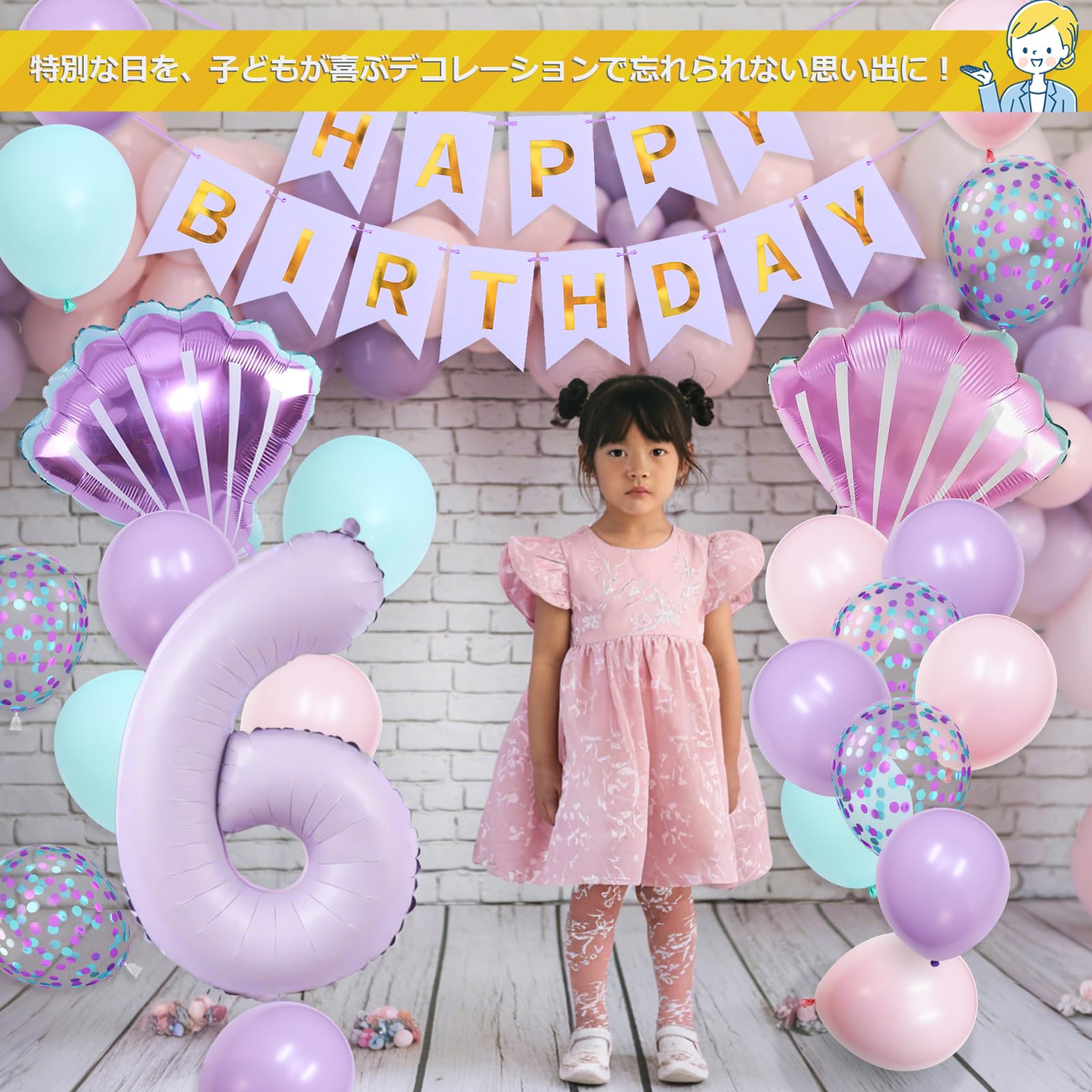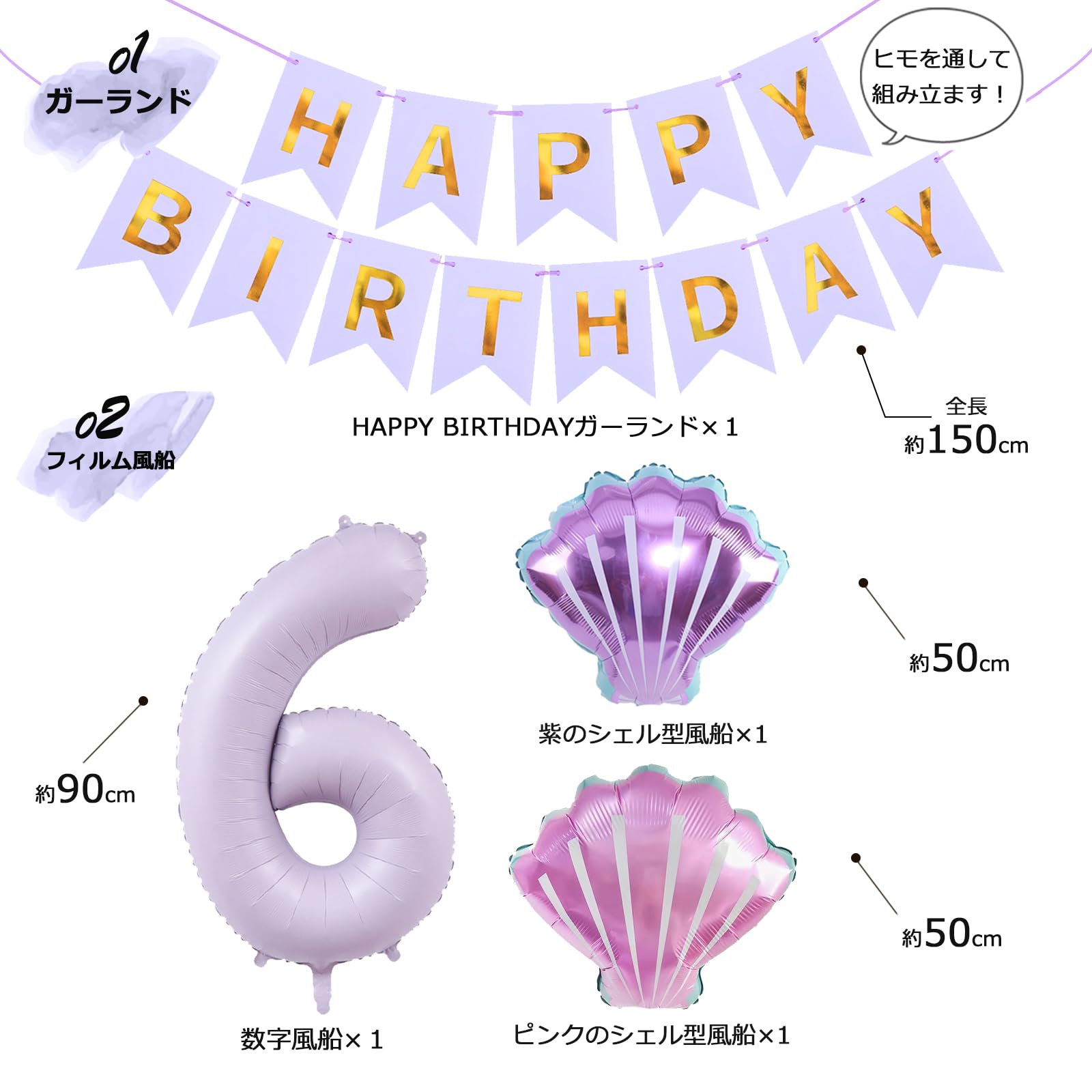Lausatek バルーン 誕生日 6歳 風船セット HAPPY BIRTHDAY バースデー ガーランド バースデー 飾り付け 数字6 シェル 装飾 お祝い イベント 子ども 男の子 女の子 パープル