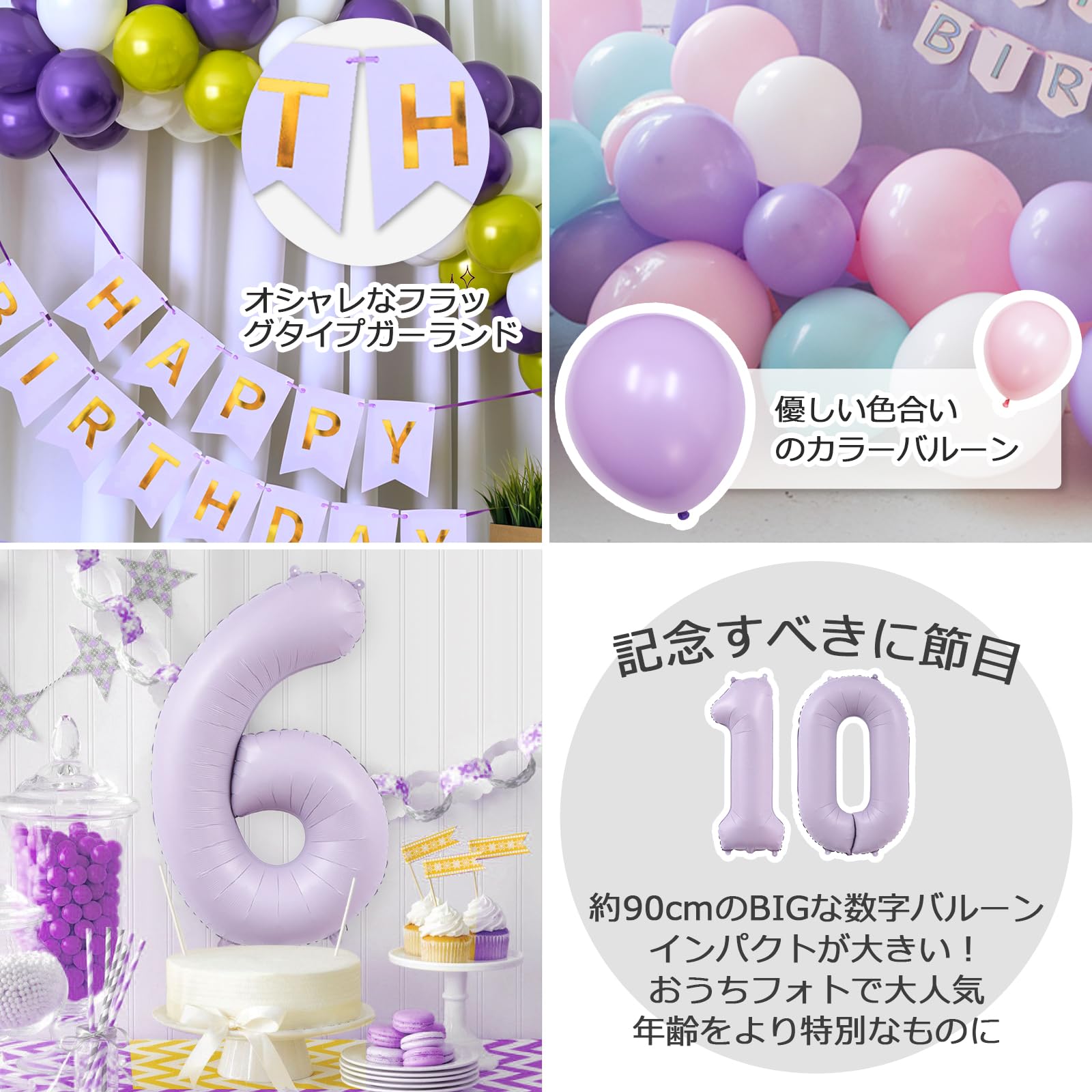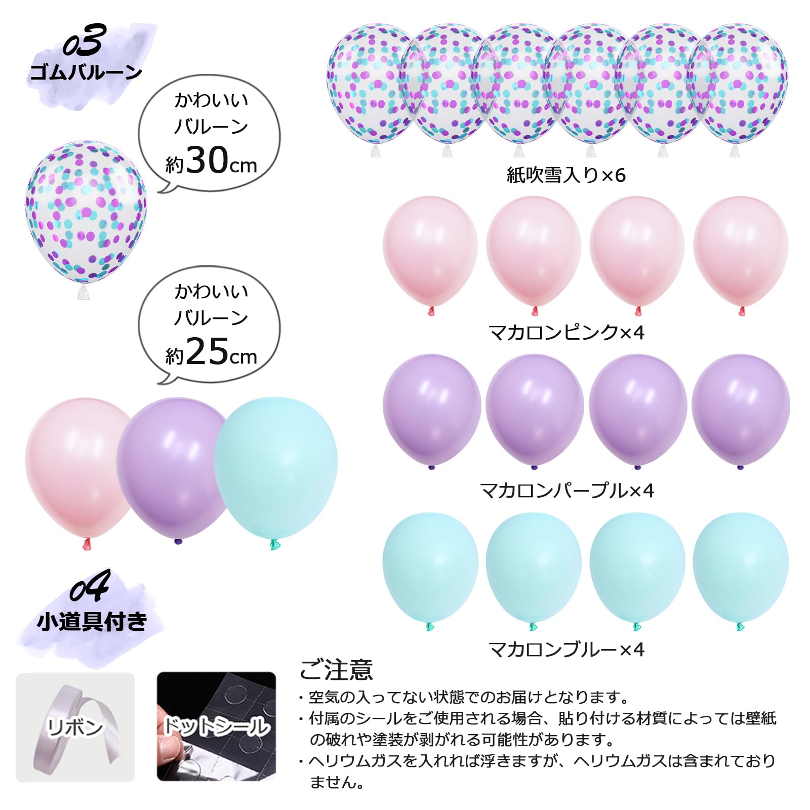 【セット内容(取り扱いの注意:対象年齢6+以上)】HAPPY BIRTHDAYガーランド×1組、ピンクのシェル風船×1個、パープルのシェル風船×1個、数字風船×1個 、紙吹雪入り風船×6個 、マカロンブルー風船×4個 、マカロンピンク風船×4個、マカロンパープル風船×4個、ドット型両面シール×1個、リボン×1個