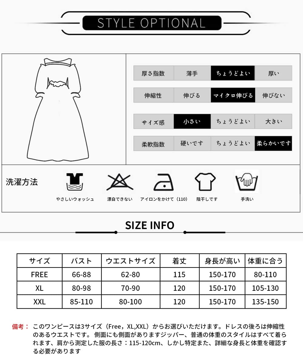 【サイズ】FREE(バスト:66-88、ウエストサイズ:62-80 、着丈:115、)/体重範囲に適している(40-55KG) XL(バスト:80-98、ウエストサイズ:70-90/体重範囲に適している(55-65KG)、着丈:120)XXL(バスト:85-110、ウエストサイズ:80-100、着丈:120)/体重範囲に適している(65-80KG)