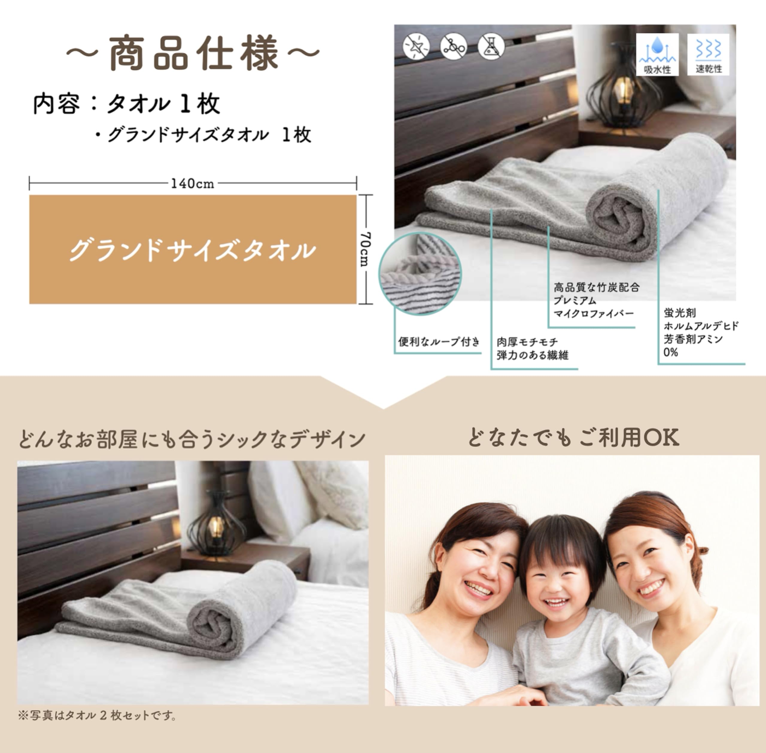 ?【内容:竹炭配合タオル1枚】グランドサイズタオル(70cm×140cm)1枚 【素材】竹炭マイクロファイバー(ポリエステル90%、ナイロン10%) 【カラー】グレー/グレーストライプ いずれかをお選びいただけます。