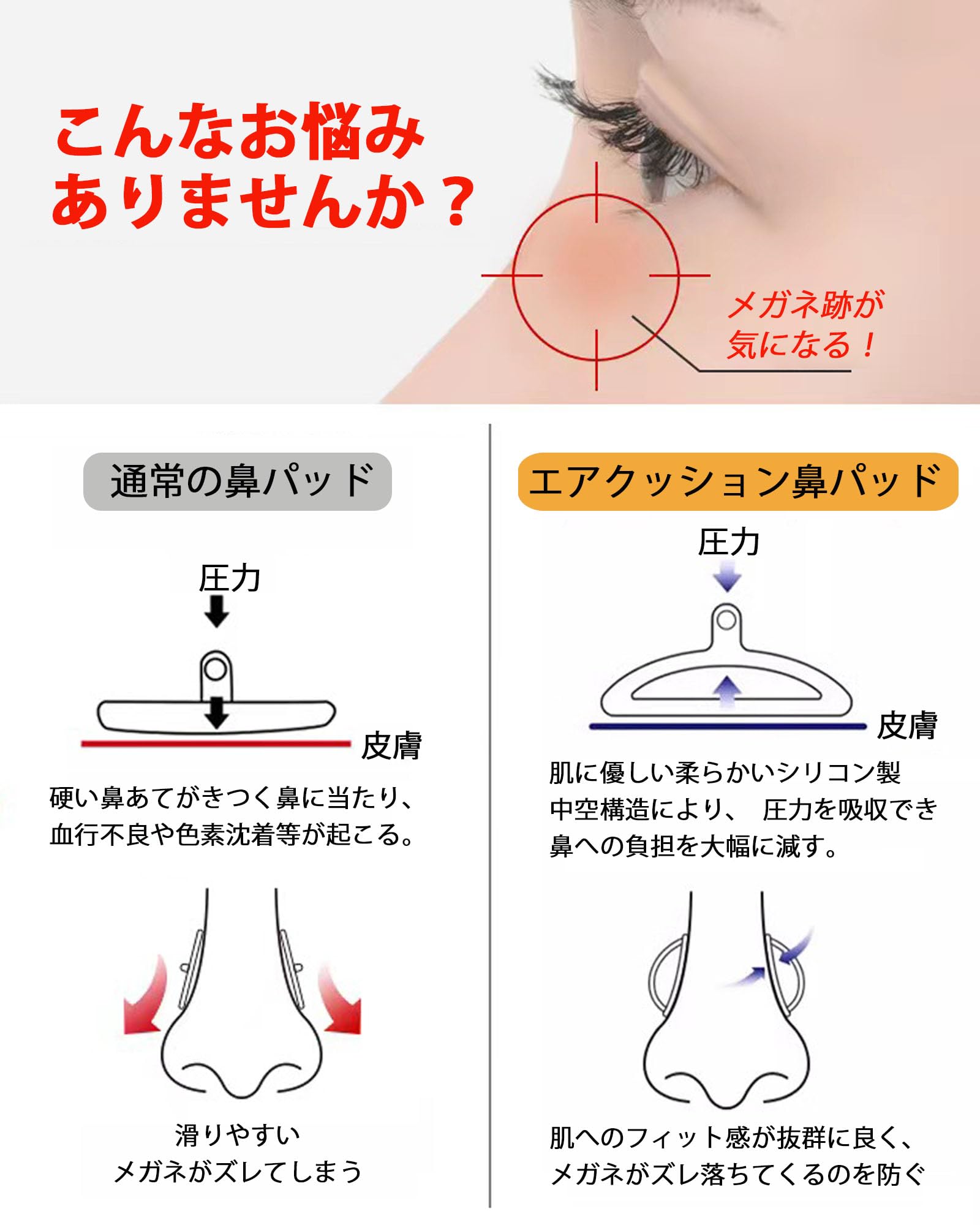 メガネを長年かけている人しか分からないこんなお悩みはありませんか:鼻が痛い、メガネがズレる、メガネを外したら鼻に明らかなへこみ(メガネ跡)が気になる、鼻パッドが黄ばんでネジが錆びて汚い等…皆様のメガネ生活をもっと楽に暮らせるようにという気持ちを込めてこの商品を開発致しました。