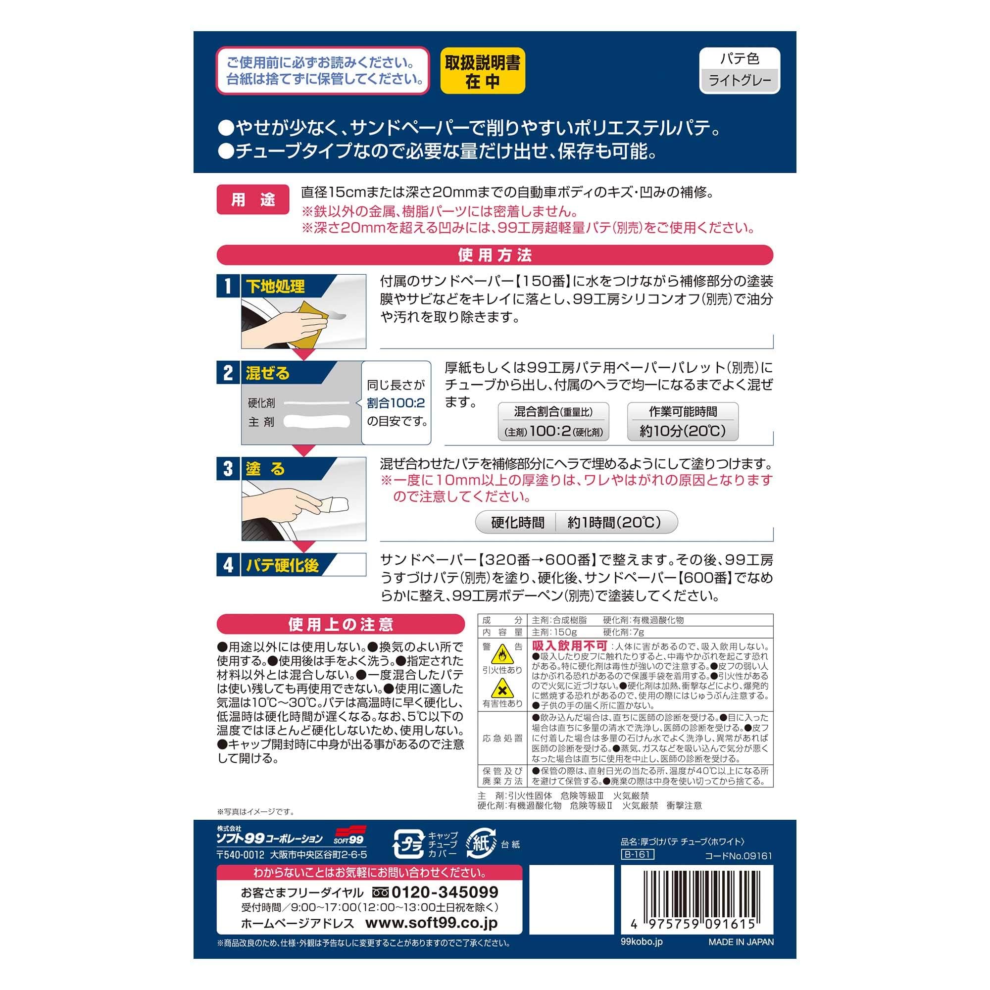 ソフト99(SOFT99) 99工房 補修用品 厚づけパテチューブタイプ ホワイト 150g 直径15cmまたは深さ20mmまでの自動車ボディのキズ・凹みの補修 09161 【内容量】 パテ:150g 硬化剤:7g 梱包サイズ:30×130×200mm 付属品:サンドペーパー 白・ホワイトパール系の自動車ボディの大きなヘコミ・キズ埋め用パテ 色: ライト、ホワイト ソフト99商品