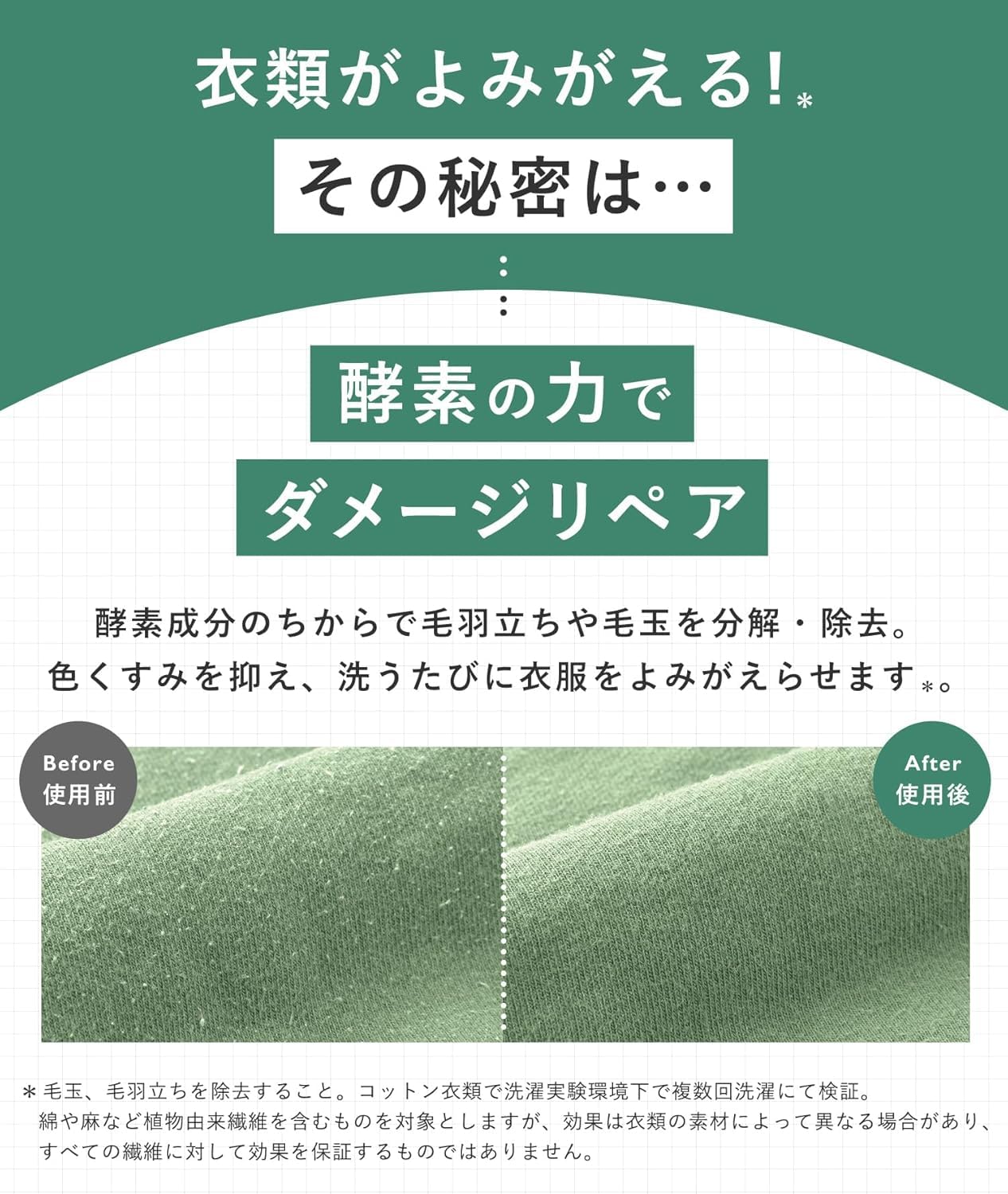 ??【天然酵素技術】サステナビリティ先進国デンマーク開発の酵素成分「セルラーゼ」配合で、毛玉・毛羽立ちを分解・除去し、お気に入りの服を購入時の状態に近づける柔軟剤