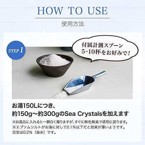 ・浴槽のお湯が150?の場合は、エプソムソルトを約150g〜300g必要です。(付属の計量スプーン5杯?10杯) ・1回の入浴でエプソムソルトの量は0.1%以上にしてください。 ・お風呂から上がったら、ゆっくり身体を休めましょう。 ・上がり湯はいりません。アトピーの方は保湿剤の併用をおすすめします。 ・その他、マッサージソルトとしても黒ずみ、角質の気になる部分にエプソムソルトを適量、手に取り、直接なでるようにマッサージしてください。
